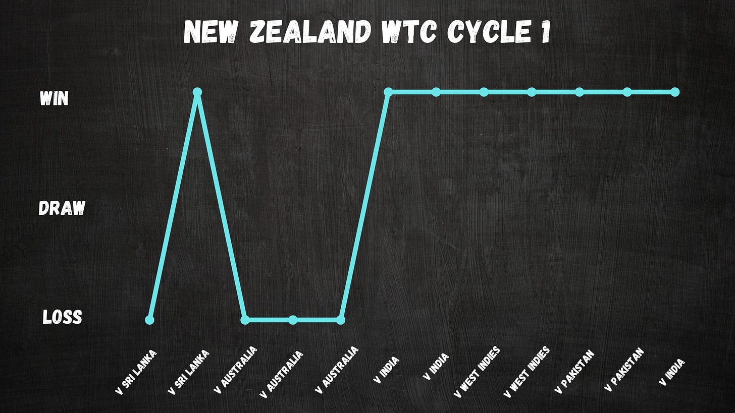 NZ won 1 out of 2 Tests in Sri Lanka in WTC 1. In this cycle, they did not win a single Test in 4 games vs India & Pakistan.