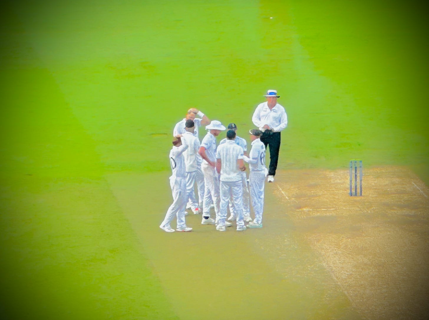 They have an emergency meeting between overs. Seven of them, all talking at once.