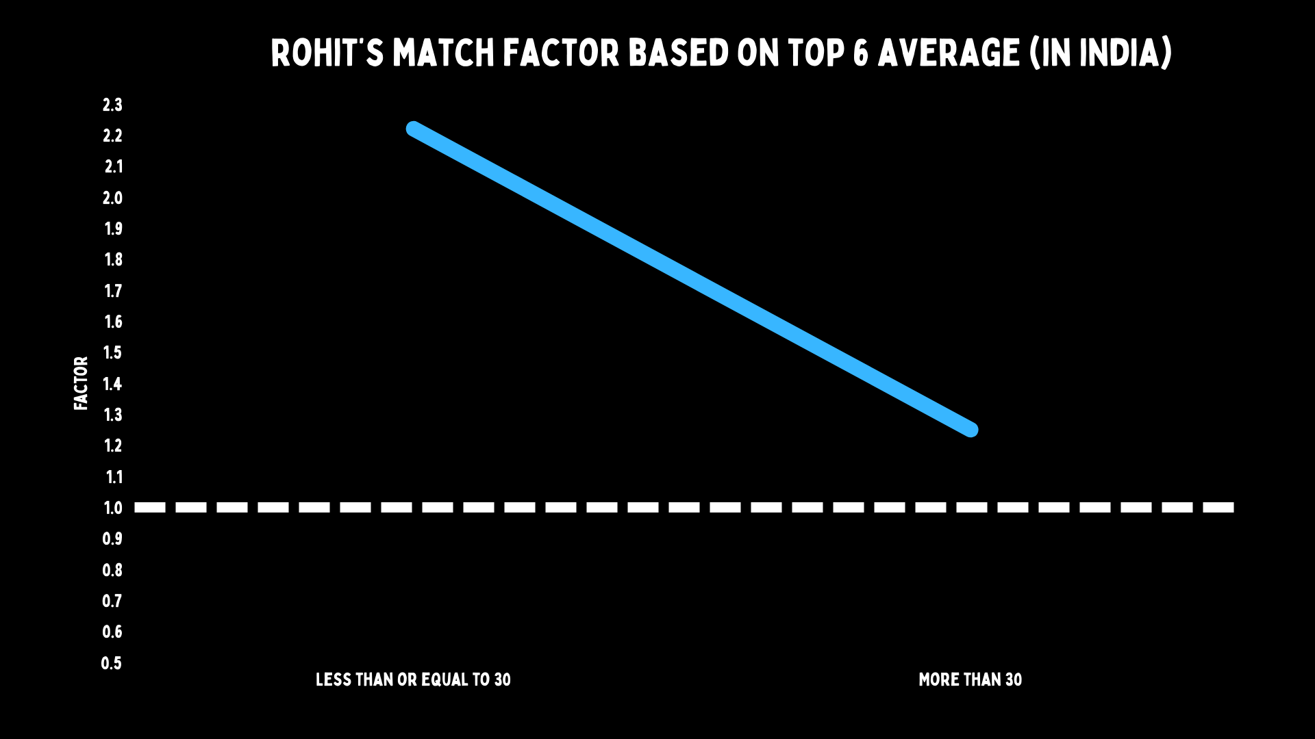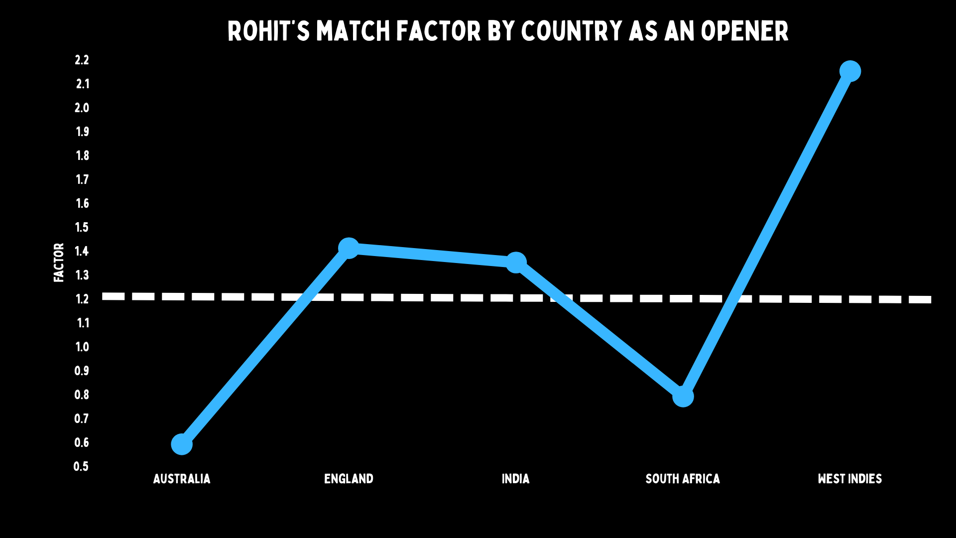 There are no straight lines for Rohit; look at his match factor for each location. He was horrendous in Australia and South Africa, but magnificent on Indian wickets and in the UK. Try straightening that out.