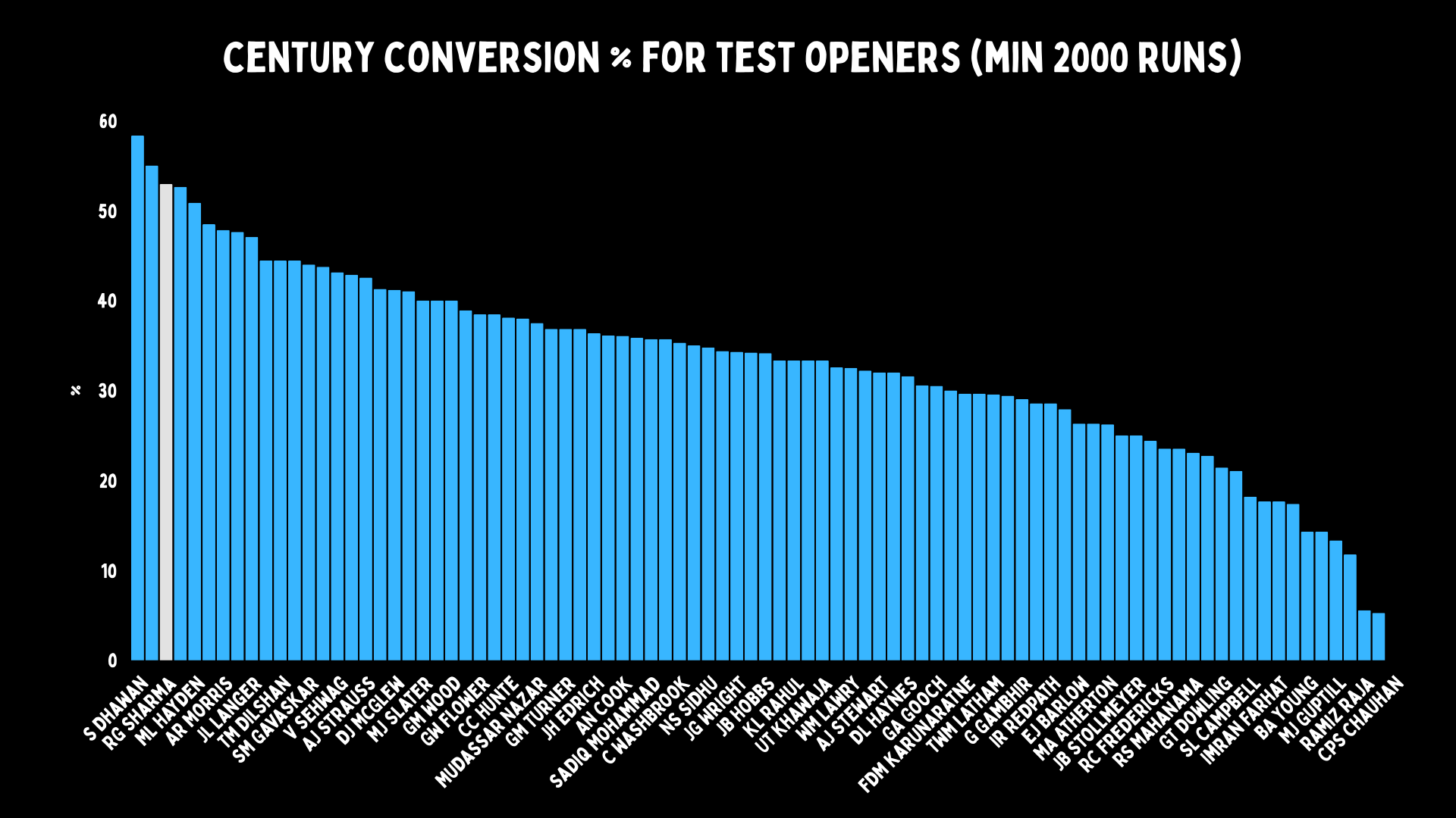 He was all or nothing, so his variation of scores is really high. But that also suits the kind of player he was. You didn’t want Rohit to open like Chris Rogers; you want the power, threat and intent. Because if he made a hundred, you would feel it. No one wanted to bowl to him. So his runs hit harder. And the greatest sides of all time usually have that kind of opener.