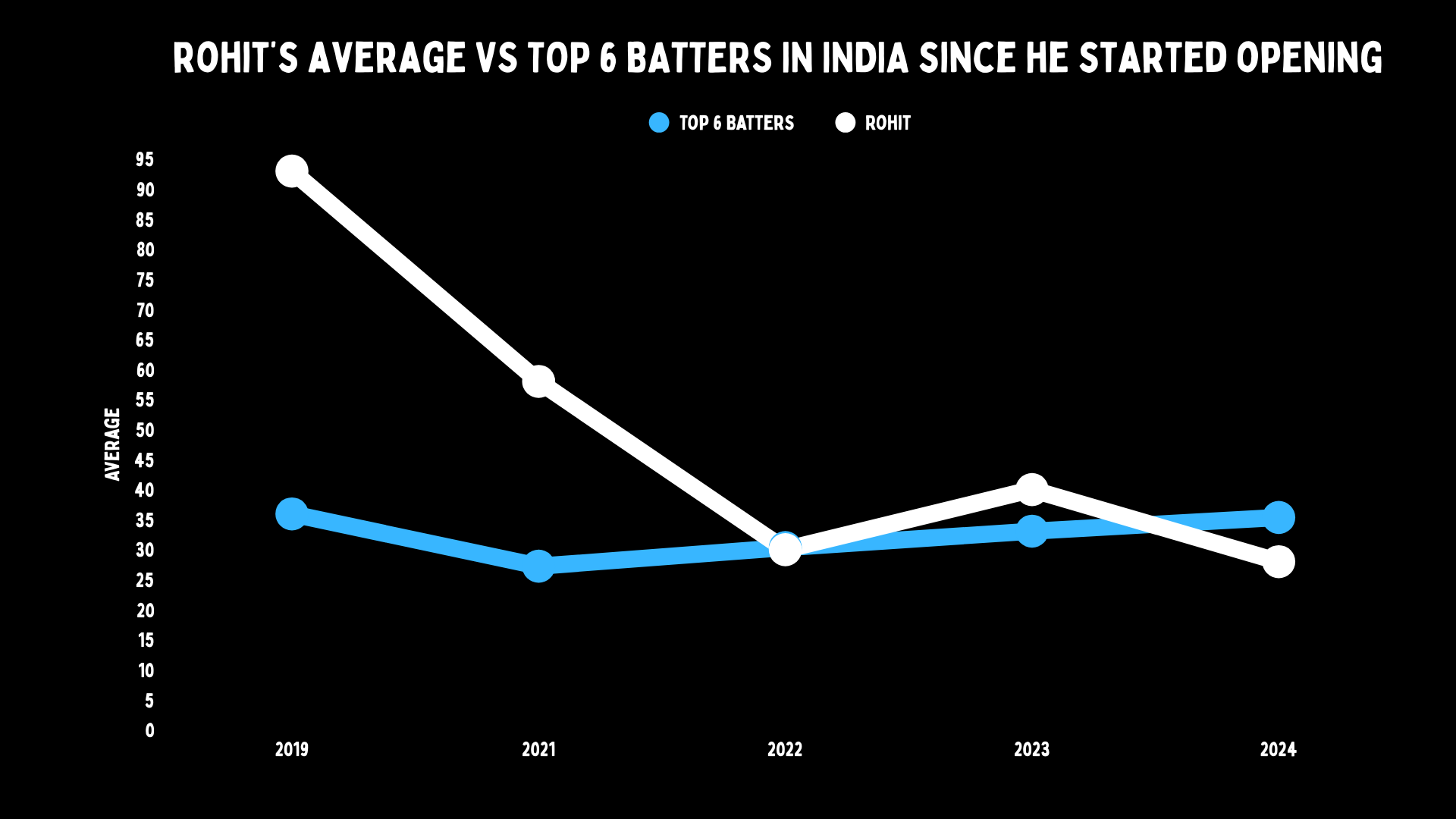 And remember that Rohit played 14 Tests in 2024 as an opener. That is the most matches he played in a year by a distance. During this period, he would appear to be washed, and yet still his average is way better opening.