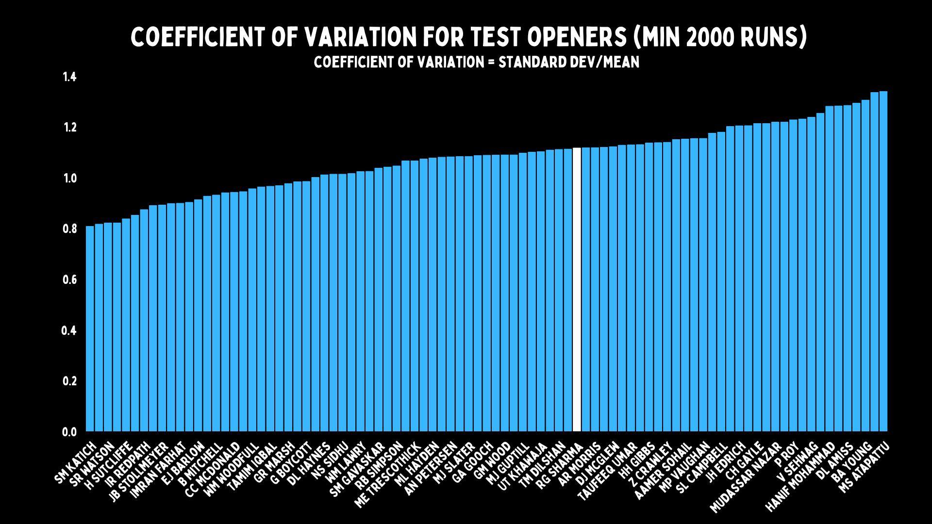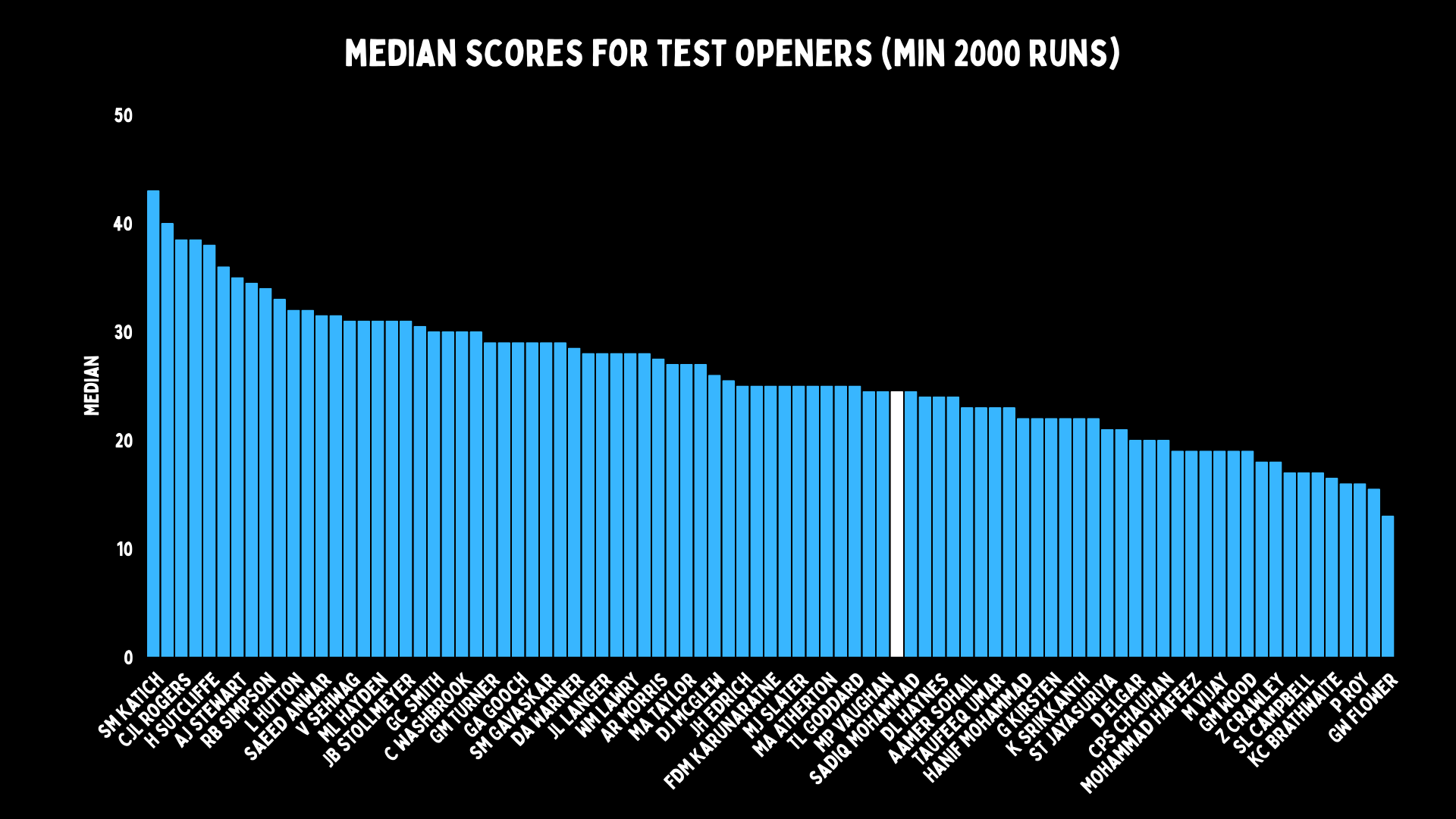 He wasn’t a consistent opener. West Australians Chris Rogers and Simon Katich would walk out to bat and come back with a score almost every time. They have high median scores. Rohit is down the other end, making more hundreds than 50s as an opener.
