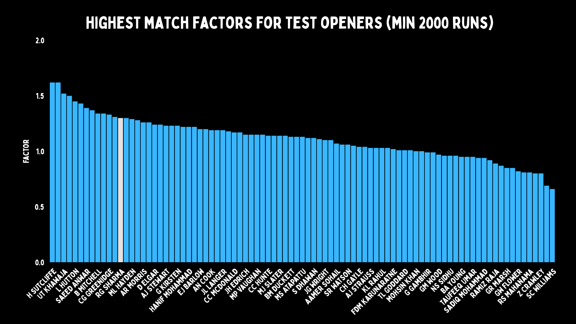He is not one of the greatest openers of all time, but average is probably an unfair way to look at him, as for most of his career he batted on really tricky wickets home and away. So we have him as 30% better than the players in his games. Chris Rogers has a higher average, but Rohit was better.