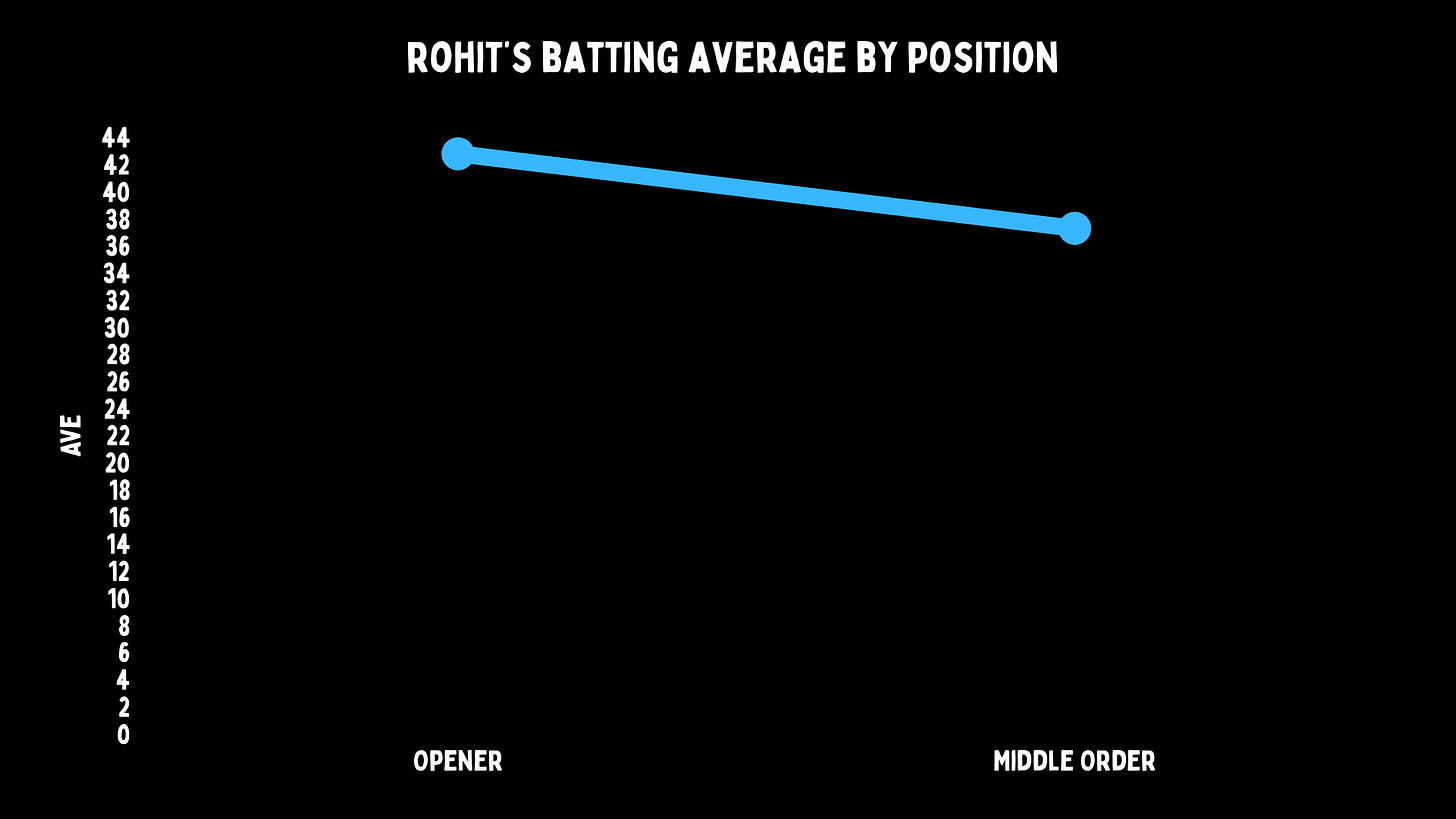 Opening is way tougher, it is the hardest spot. When writing The Art of Batting, we had to factor in that openers make fewer runs than anyone else. There is a tax on batting at the top of the order, and Rohit did not pay it.