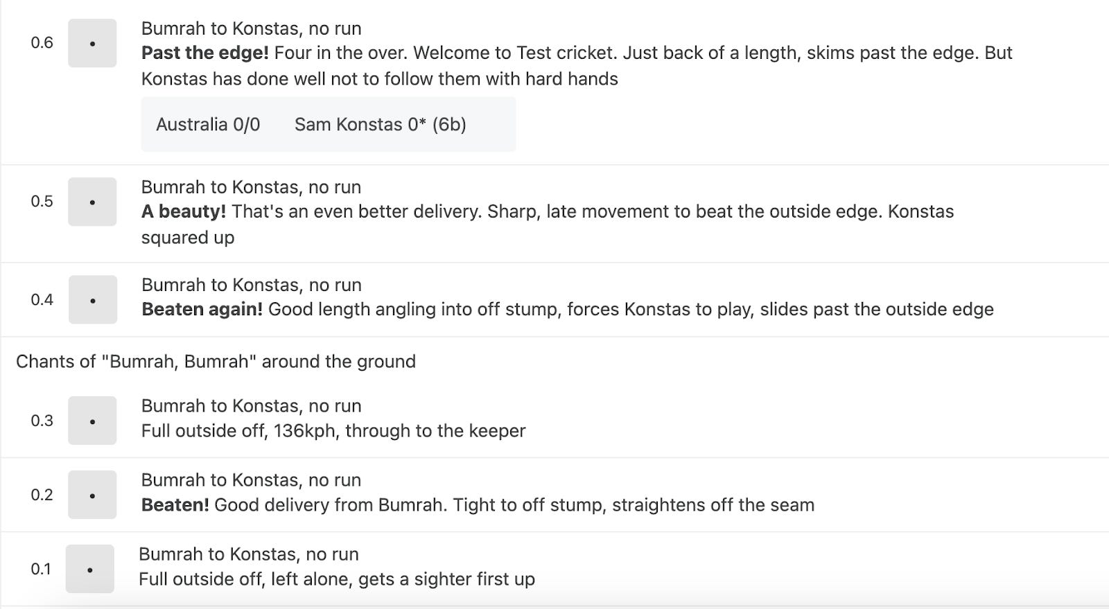 But the actual innings started normally for modern cricket. India moved the ball around, and Konstas missed it. He was beaten four times in the opening over. He was taller than McSweeney, but using a Kookaburra, so it might as well have been the same guy.