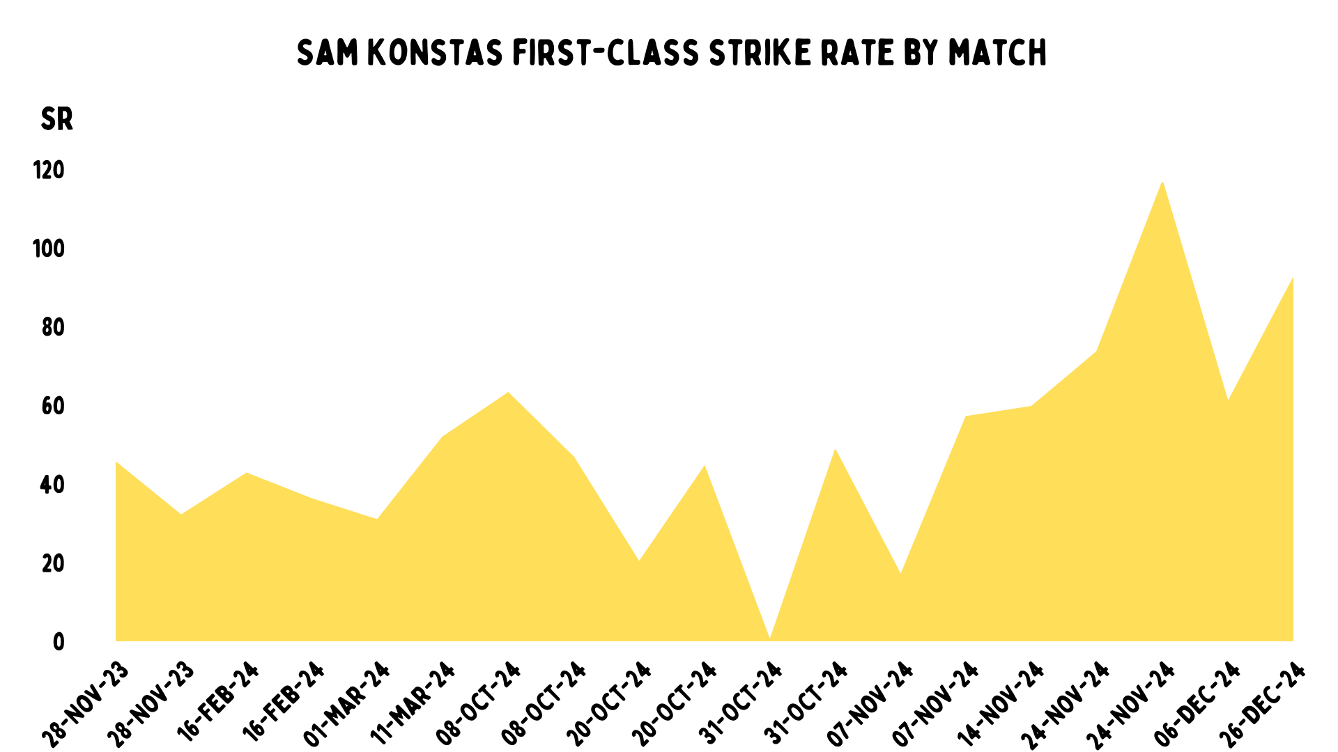 Sam Konstas ran out to bat. It was so noticeable, because that is not how people usually go about it. He was like a frisky two-year-old colt that had not yet been gelded, a puppy with too much energy. He had a mullet and a moustache, and a new bat he seemed to have received from Santa.