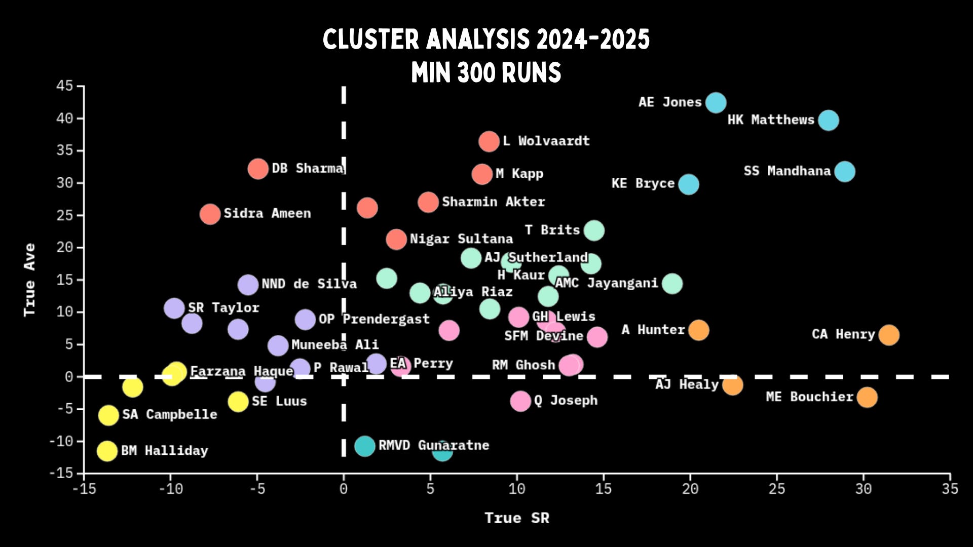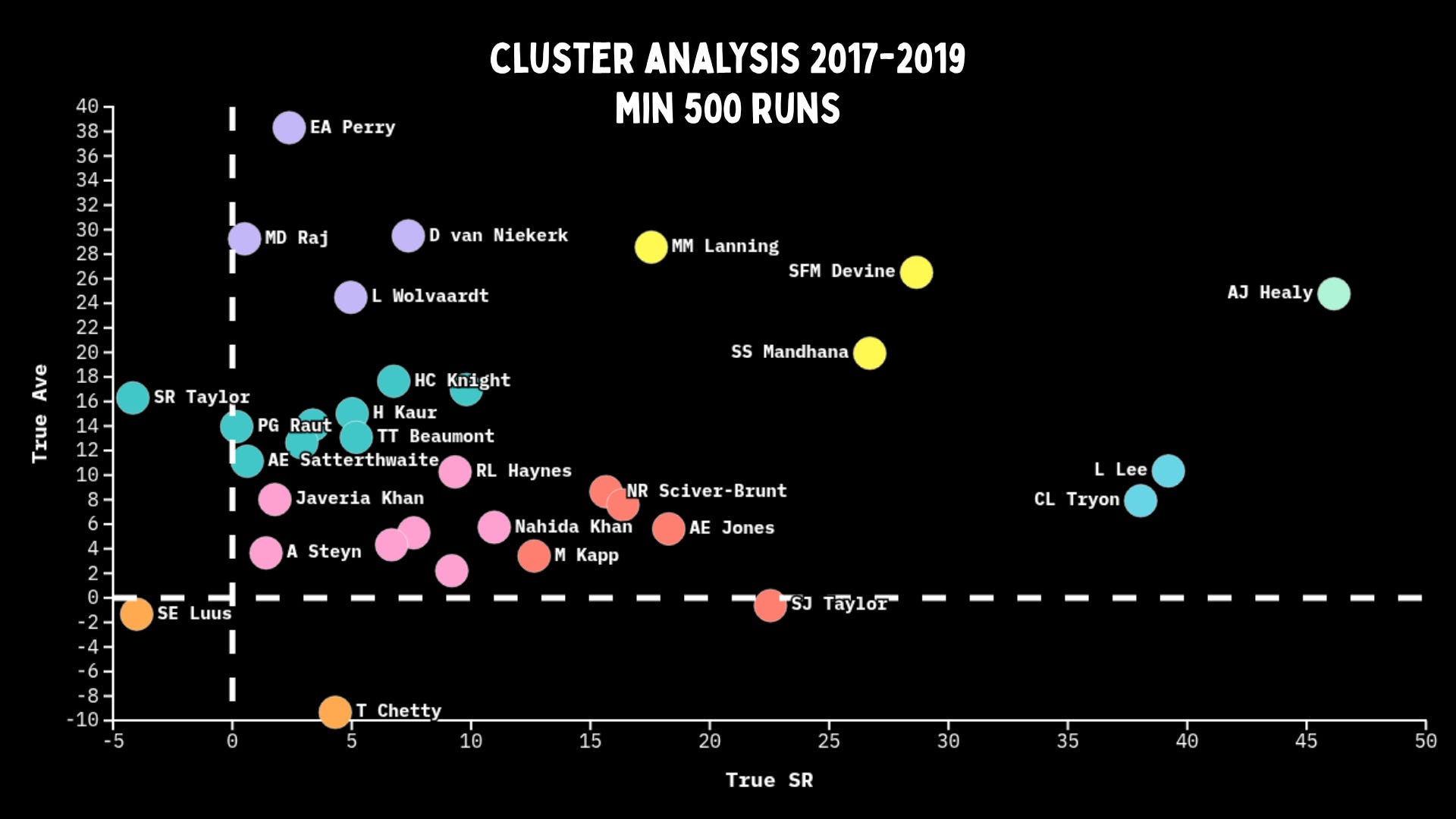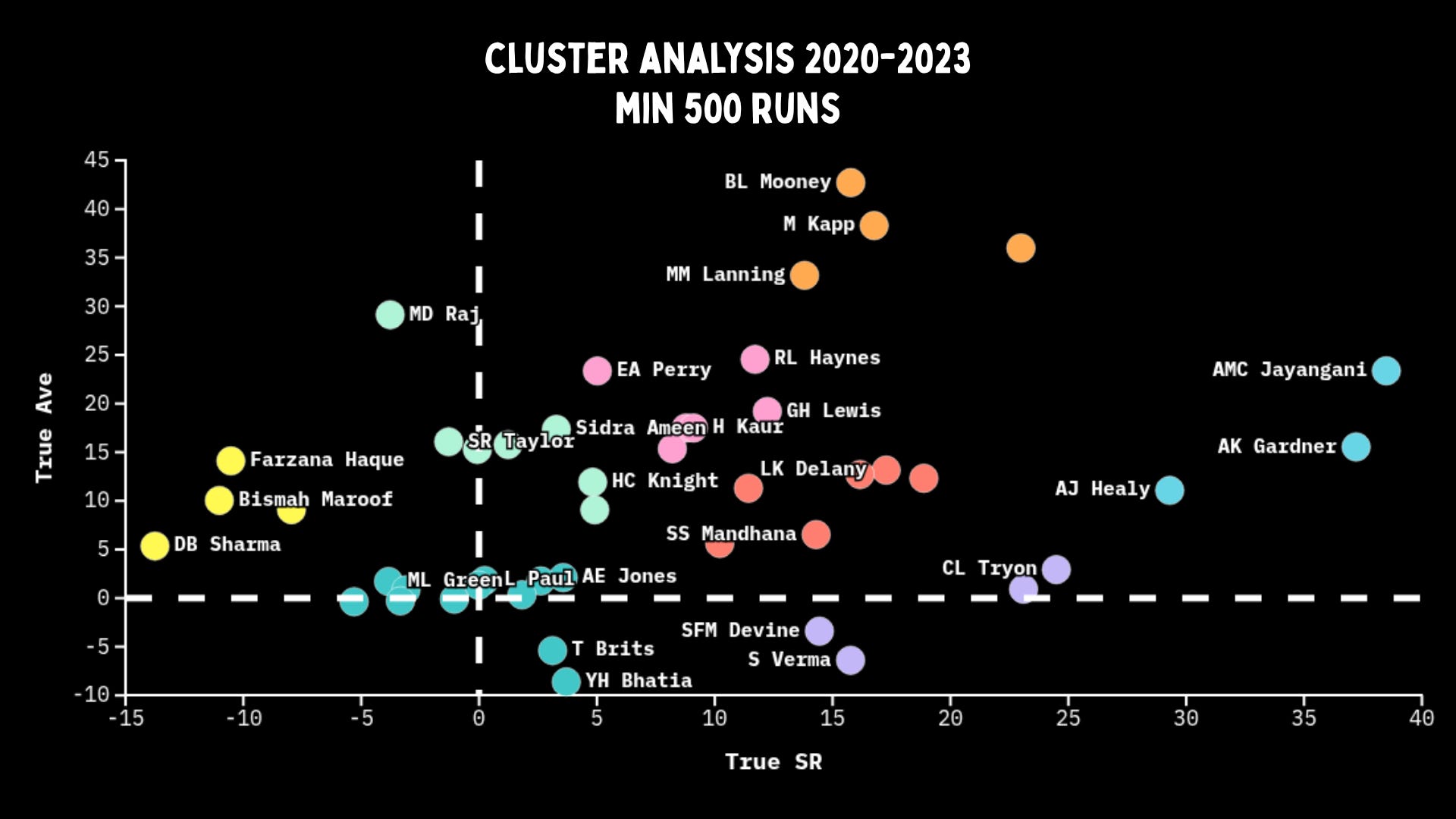 The other two players in her cluster in the early peak period were Meg Lanning and Sophie Devine - consistent batters who didn’t trade runs for strike rate, unlike the Mithali Raj and Ellyse Perry cluster. Or vice-versa, like Lizelle Lee and Chloe Tryon.