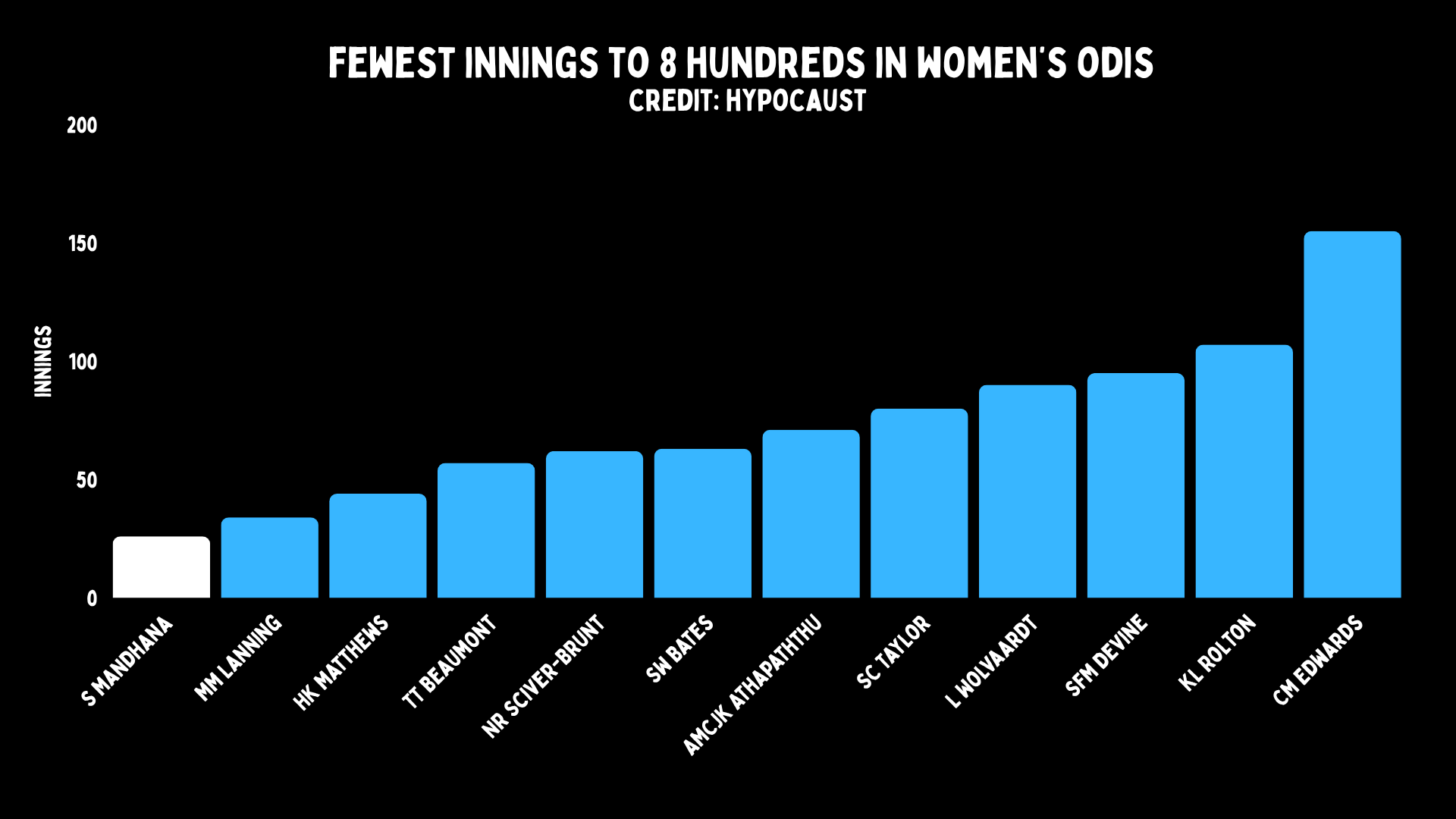 This was her eighth hundred in her last 26 innings. Nobody has ever had such a streak - not even Lanning, who took 34 innings at her best. In fact, only 11 other players have eight or more centuries in their entire career.