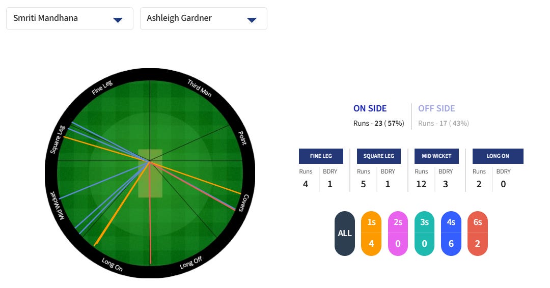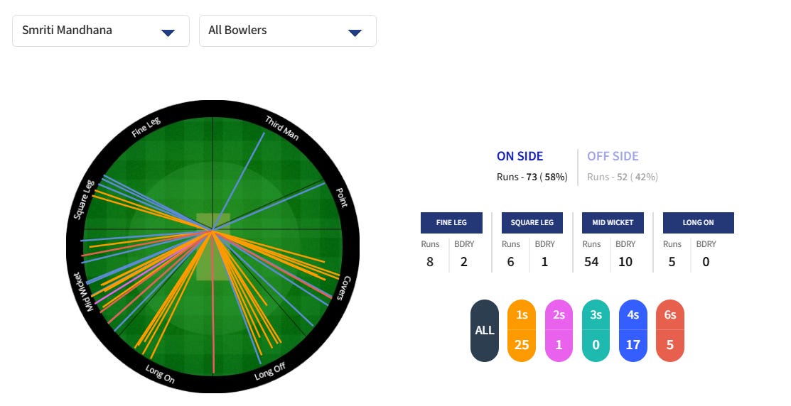 But Smriti hasn’t just cracked consistency; it’s also the speed at which she’s scoring truckloads of runs. In Delhi, she is not afraid to use her feet and put the pressure back on Australia. Her boundaries are in a variety of regions - down the ground, towards midwicket and covers, as well as behind square on the legside.
