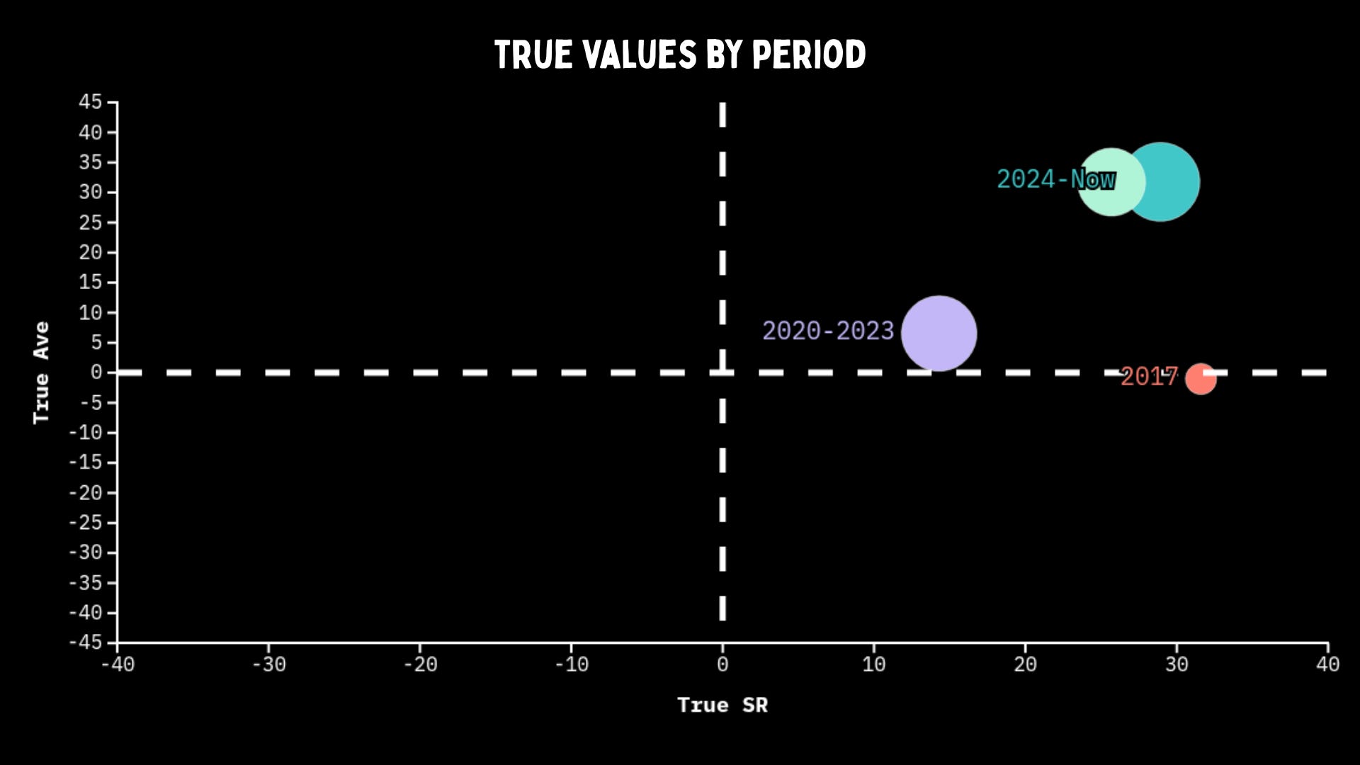 However, what we’ve witnessed since the start of 2024 is absolutely magical. Only four batters have a better true average, and just two surpass her true strike rate.