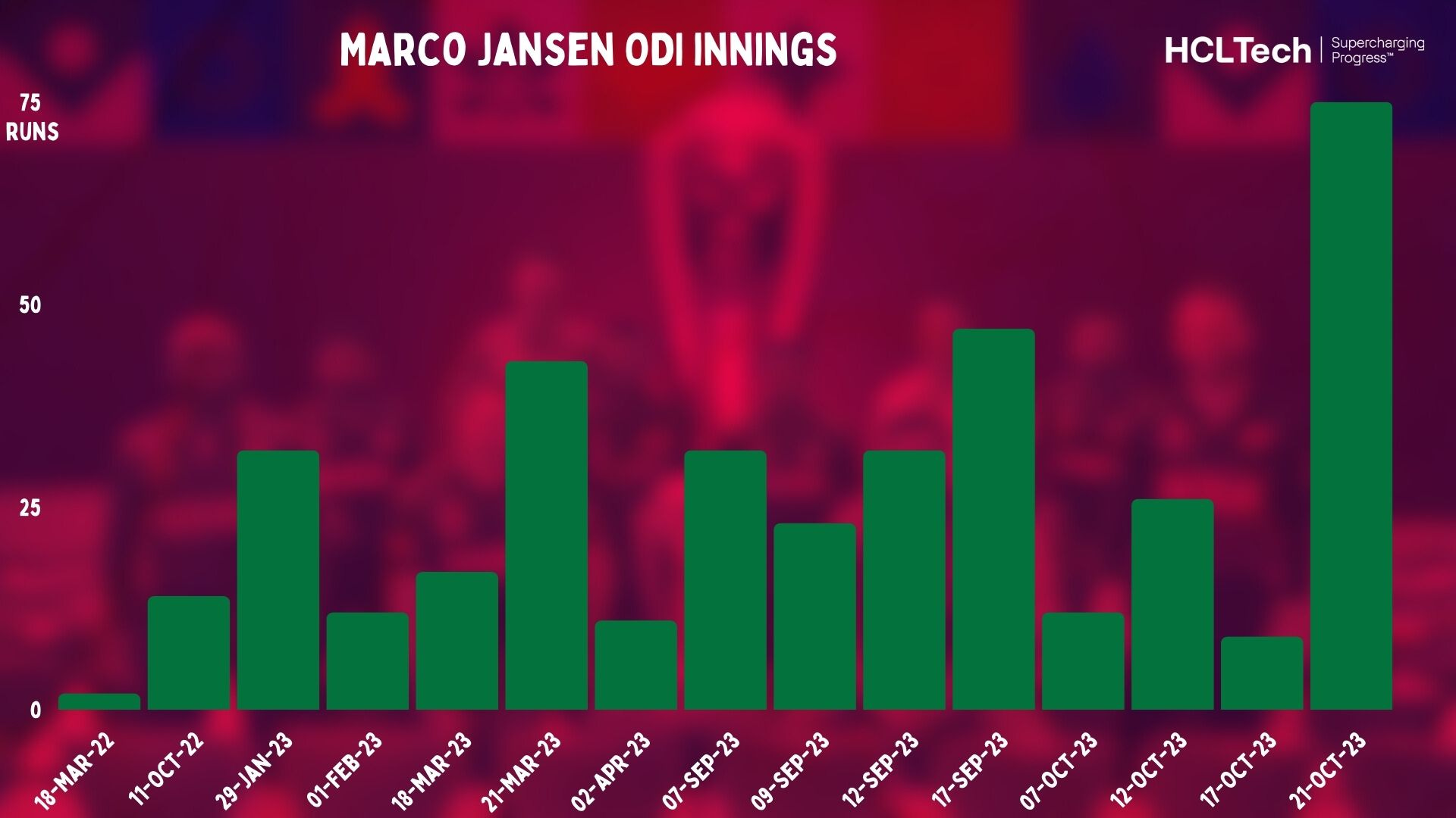Jansen has been incredibly consistent with his runs in ODIs so far. This was obviously a step up, for a couple of reasons. One is South Africa have got used to having no batting at number seven and their top order just deals with it. But also today England actually got to the number seven position early. And instead of opening up an end, they actually got smashed more.