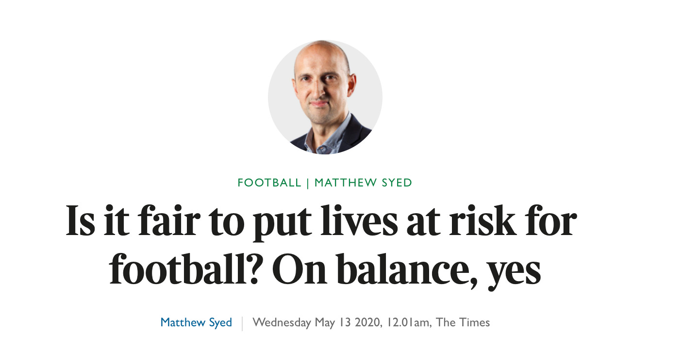 I'm not sure I would have believed that before Covid, but the last year has been a lesson in the way many people think about sport. This article by Matthew Syed was written a year ago, it's really an amazing piece of work.