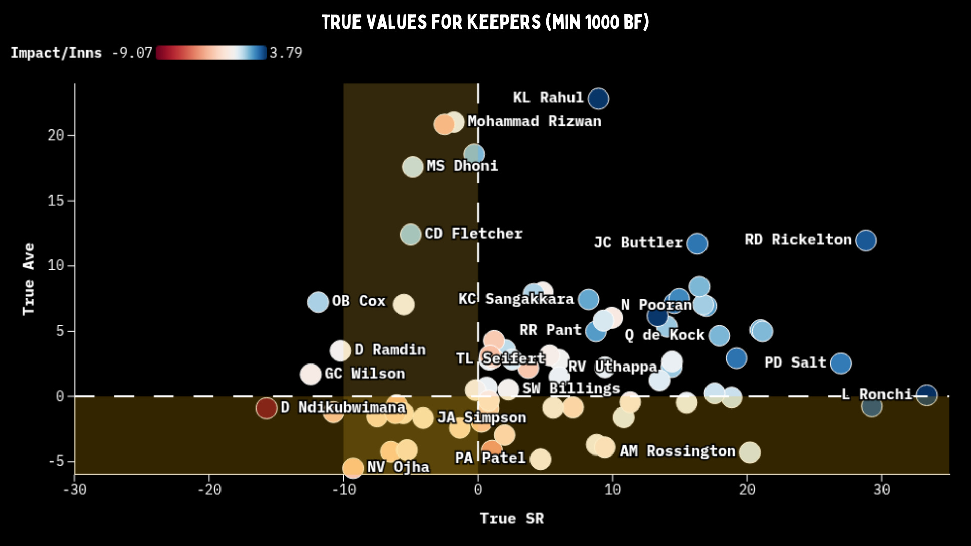 But one of the more interesting stories might be that Kumar Sangakkara and Rishabh Pant basically have the same true strike rate. One is the finished article, and Pant is still in development as a T20 player. So his output will continue to change.