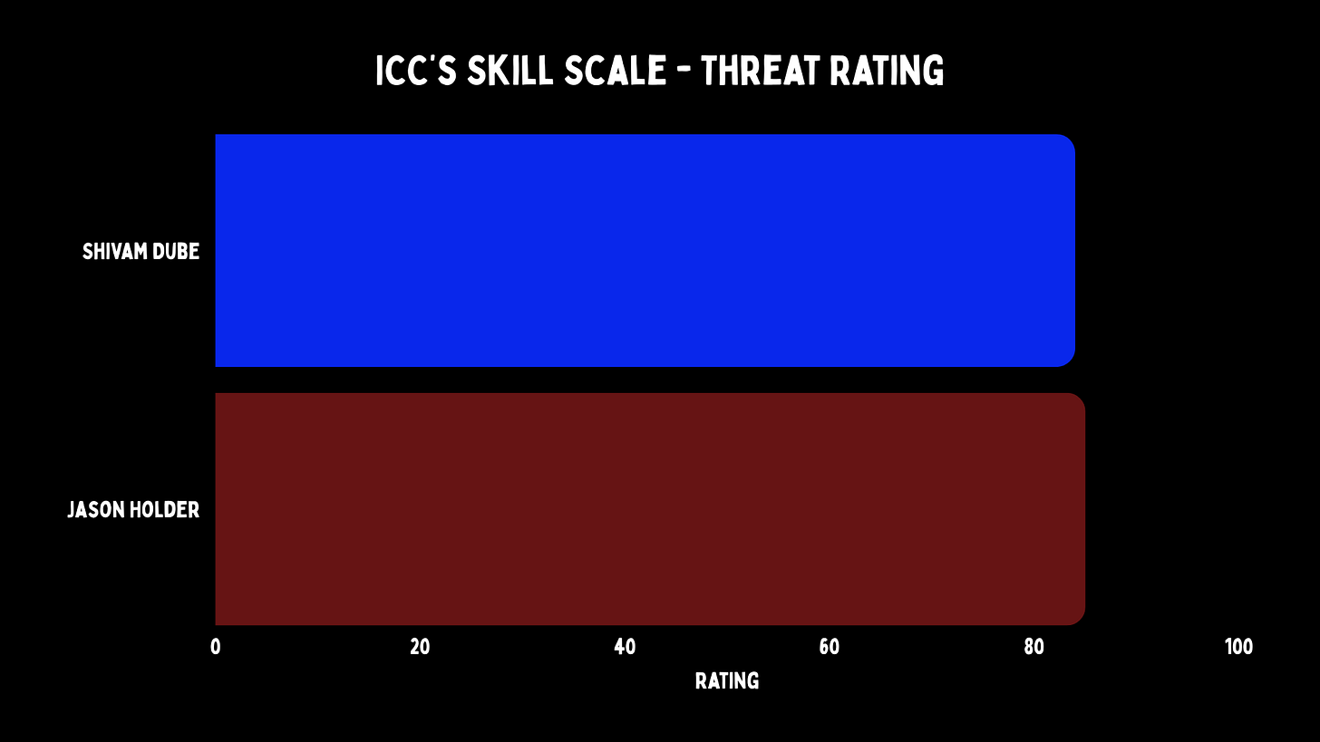 According to the ICC’s skill scale, Shivam Dube and Jason Holder are rated as equally threatening. But it’s worth noting that in the last year, Holder broke the world record for the most wickets in a calendar T20 year.
