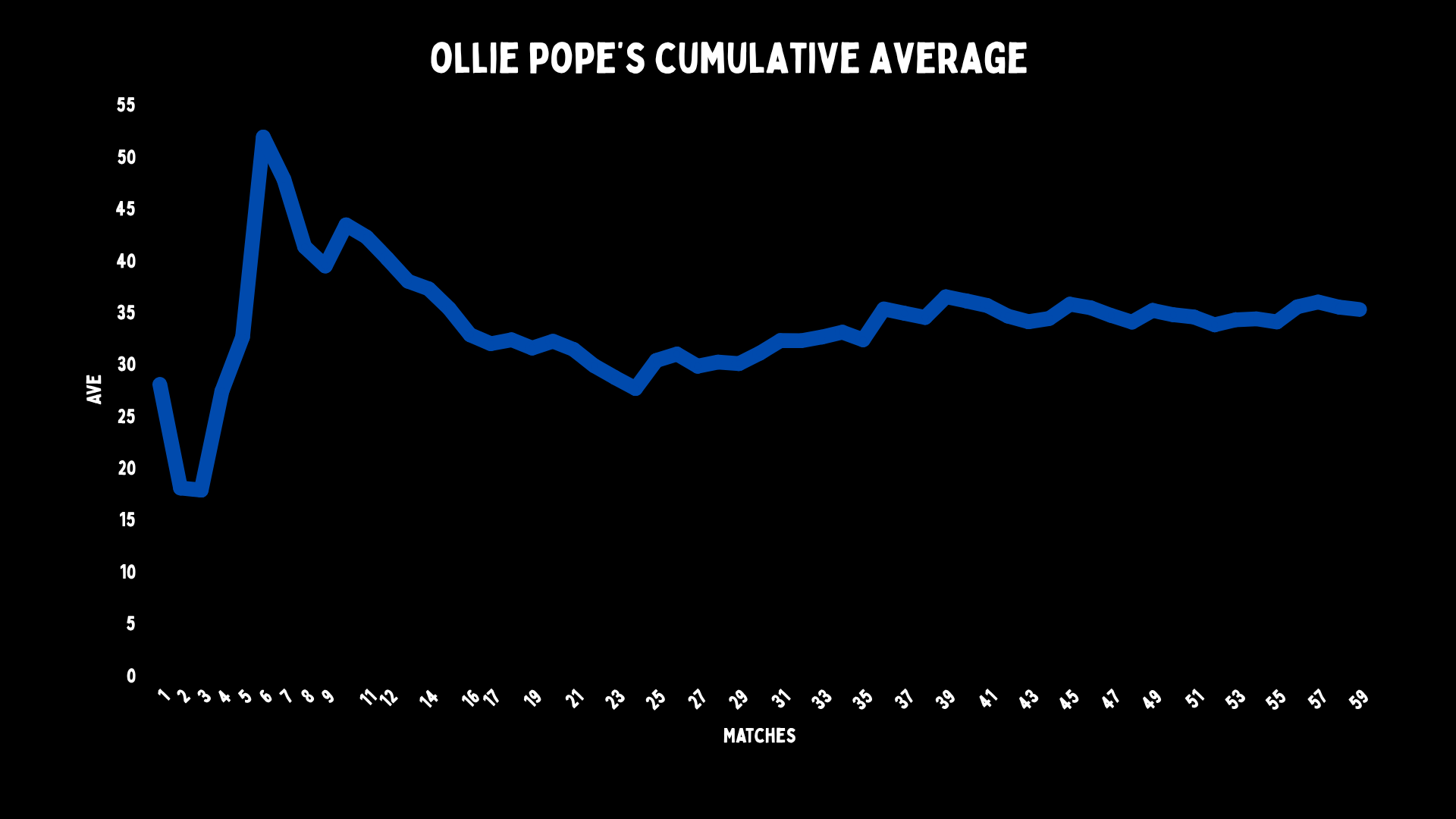 This is not a normal batter. His record looks like it was put together by a bunch of toddlers. There is nothing standard or straightforward about Ollie Pope. He is a miraculous bastard child of modern batting. Maybe this weirdness is our future. A weak-chinned chimaera patrolling cricket’s run barren landscape feasting on scraps.