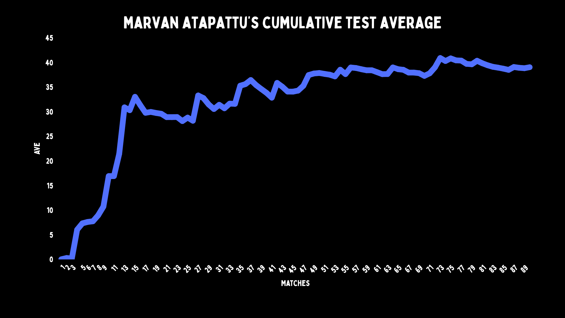 Unsurprisingly, his fourth match was in 1997. This time, he stuck around. However, after nine matches, his top score was 29, and he was averaging ten. From there, he had a respectable career, playing until 2007 and finishing with an average just under 40. At one stage, he got it above that. Considering he forfeited his early career, it was one of the best career comebacks ever.