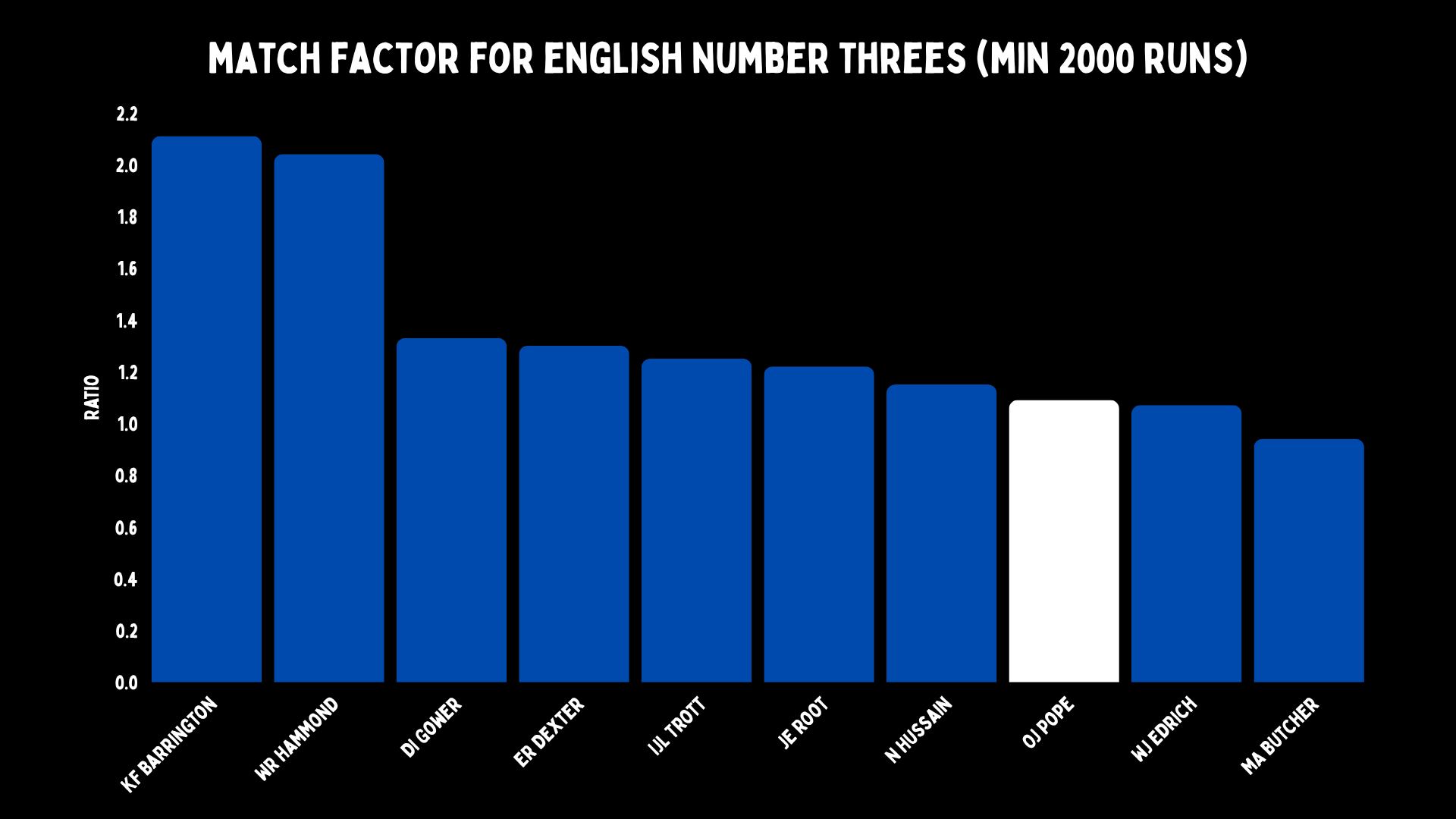 But it is worth looking at his match factor as well. The first four players on this list are legit England greats. The first two are top 20 batters of all time candidates, we toyed with David Gower in our list of 50 for The Art of Batting, and Ted Dexter was a very high-quality player. Jonathan Trott was a big force for a short period of time. Root has only done it a little when everything else is shit for England.