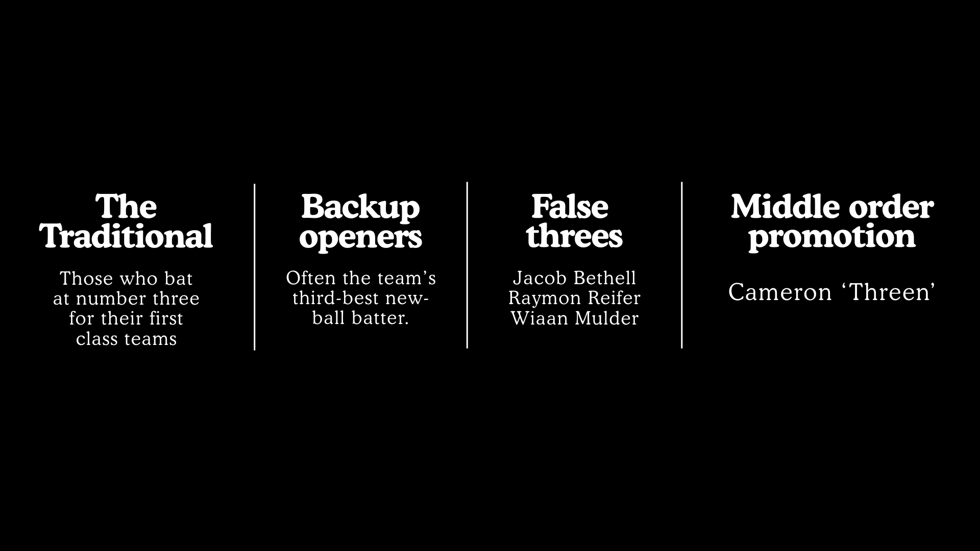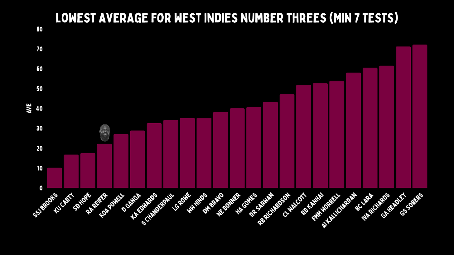The West Indies have used George Headley, Garfield Sobers, Rohan Kanhai, Clyde Walcott, Viv Richards and Brian Lara at number three. All of them are in my 50 greatest Test batters ever. Raymon Reifer is not.