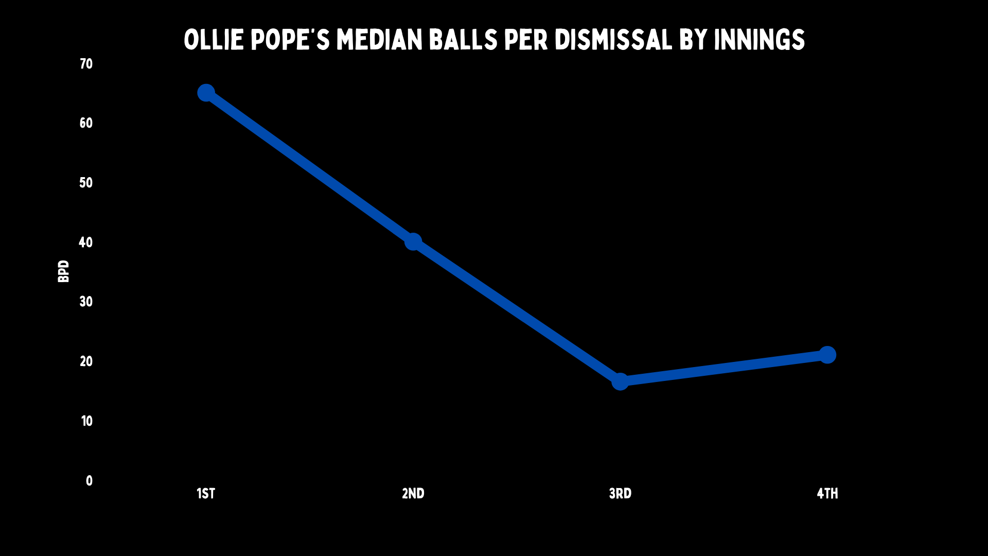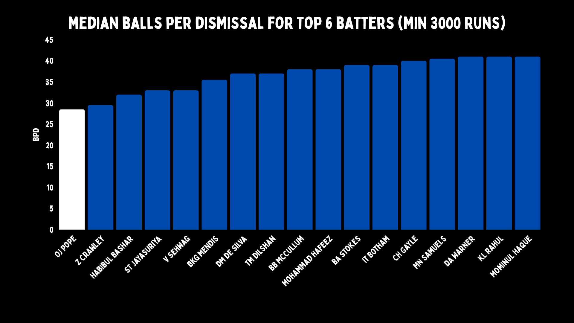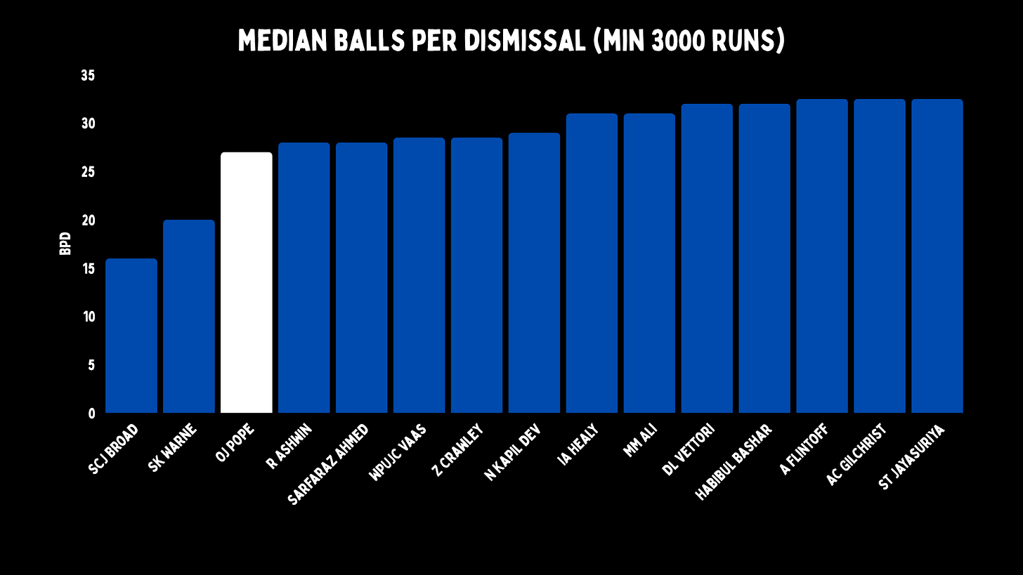 But Amiss, Atapattu and Flower were slow players, at least early on. Pope is Bazballing, and so he has the worst deliveries per dismissal median on record. This means you are more likely to see Pope fail quickly than any batter in the entire history of our sport.