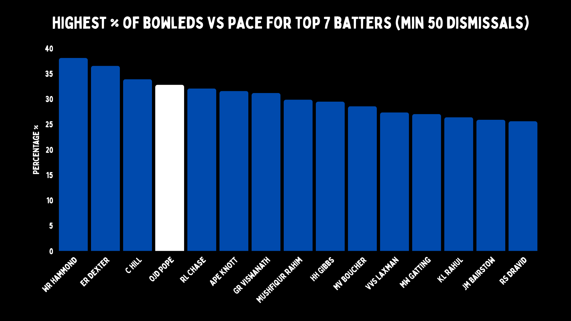 No one wants their first drop castled a lot. Except that in classic Pope style, it tells you absolutely everything, and nothing. Because the player in Test cricket who has been bowled the most by pace is Wally Hammond - England’s greatest number three. In fact, many of these players are some of the best ever.