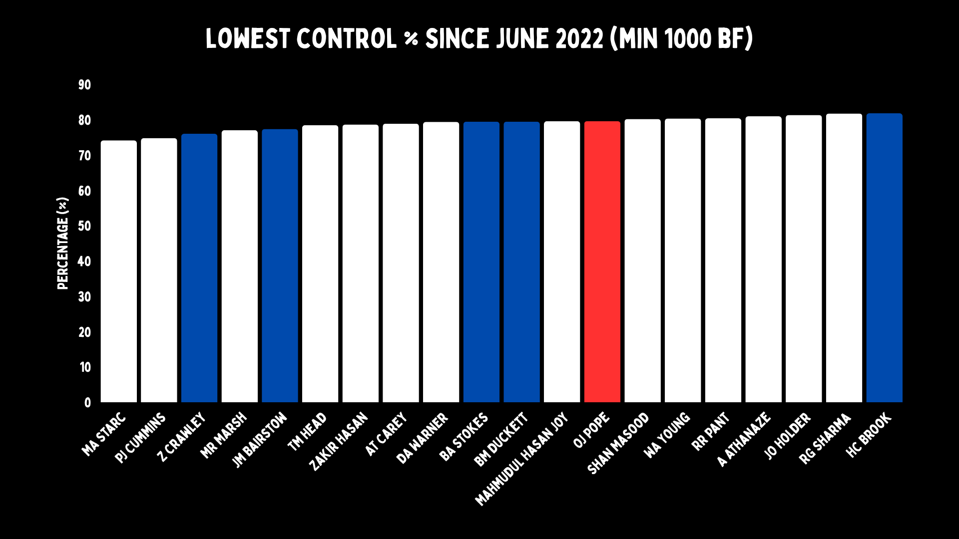 And how do Pope and England combat this? By whacking, moving Pope’s strike rate from 50 to 70. And because of that, Pope has one of the lowest control percentages in cricket. But not in his team, because there are so many other players from England here. This is their plan: disrupt, cause chaos, make their players think they are ten feet tall. Bazball has weaponised confidence. Pope’s career exists largely because he believes their hype about him.