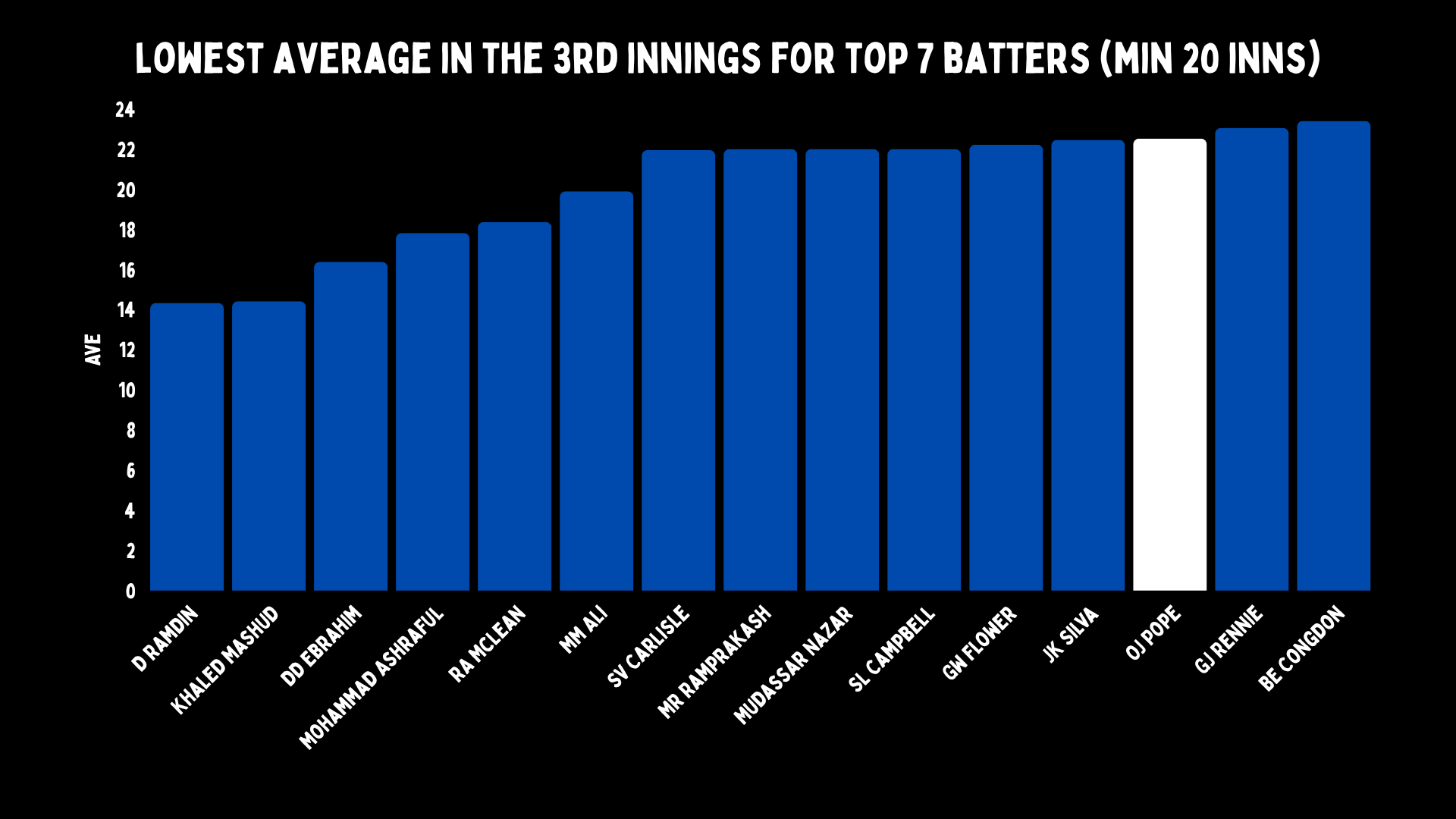 Zimbabwean opener Grant Flower has the lowest on record - 15. So Pope is not far off him. But Flower was a slow-moving opener who fought for every ball, but was a terrible starter, and more than once batted for 100 balls without crossing 20.