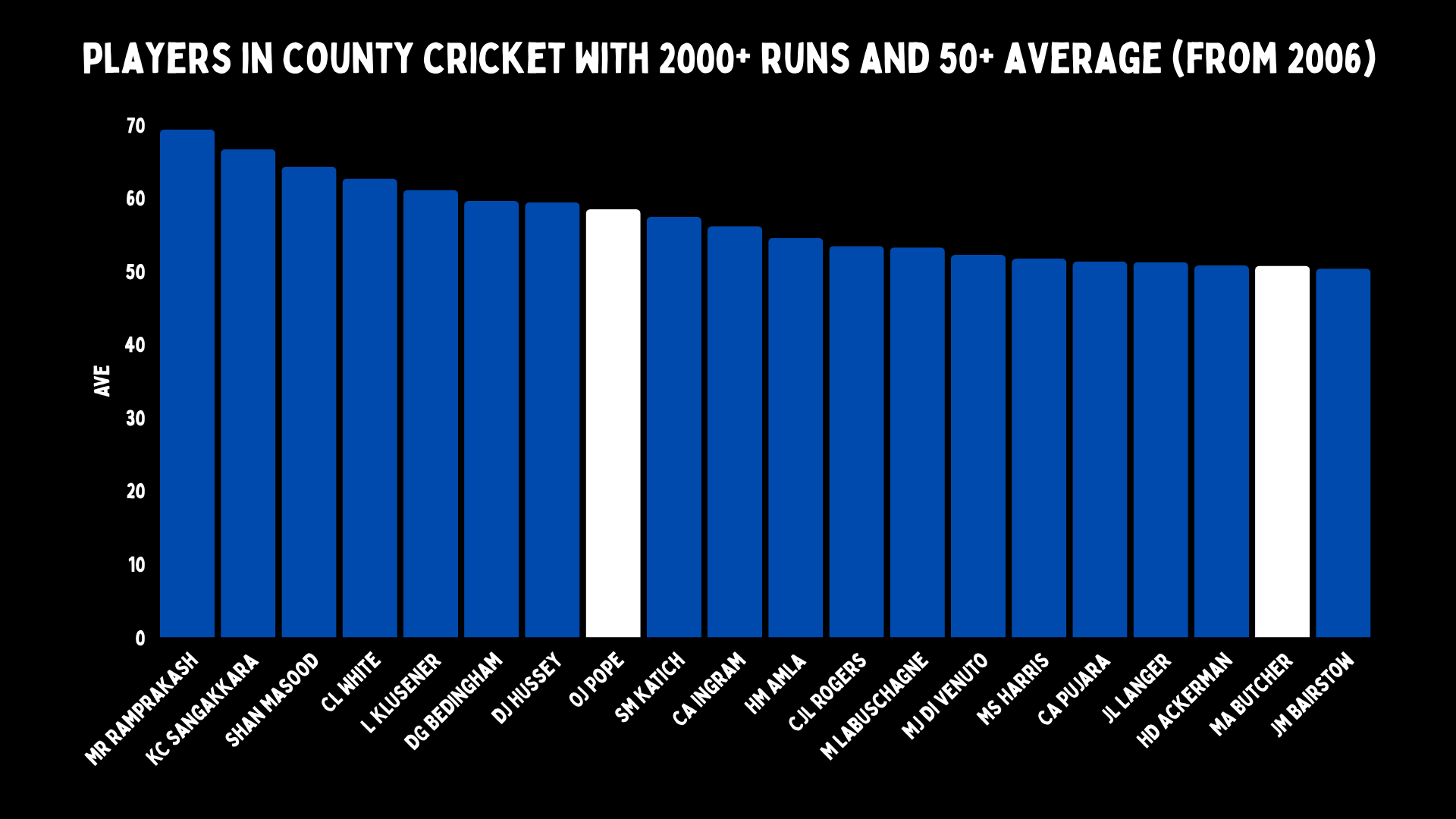 He only averages 58 in the county game now. Making runs in English domestic cricket has not been easy for a long time, and for young local players, it’s been almost impossible. But Pope has been incredible. And you can see that late-career Mark Butcher was pretty handy too.