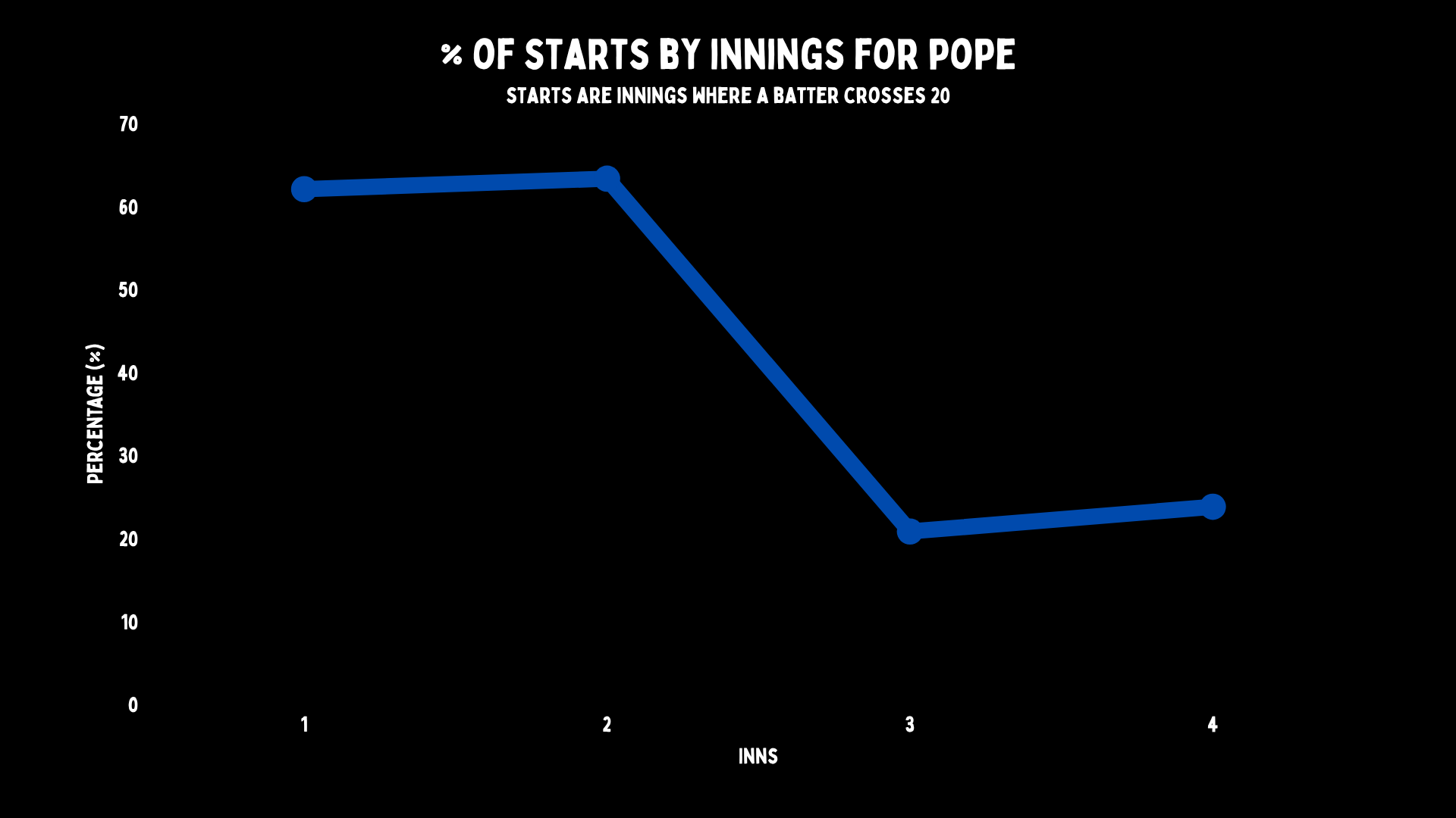 Let’s check this pattern of declining returns in county cricket. When Pope plays for Surrey, he has no issue at all. Now final innings in first-class is different, as there is one fewer day. In county cricket, he’s got a normal pattern. Pick him for England, and he gets freaky.
