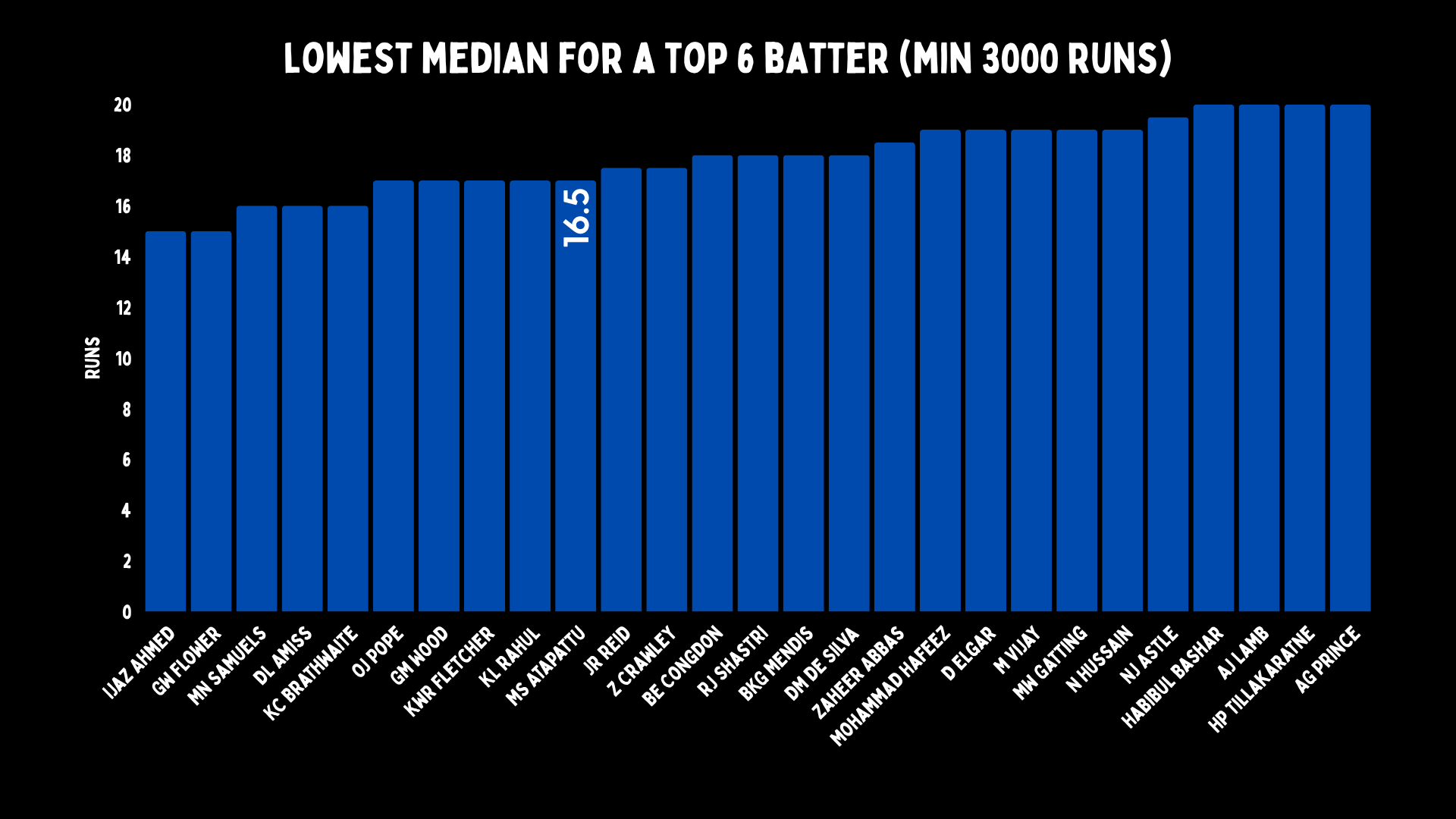Median is not something we talk about a lot in cricket; it’s average’s forgotten little cousin. It is obviously not as illustrative as average, but it does tell you things. For batters, the median is the score that lies exactly in the middle of all their innings when sorted from lowest to highest - so half the scores are higher and half are lower. 16.5 is very low. The average median score for a top six Test batter is 26.2. The median median is 26.5.