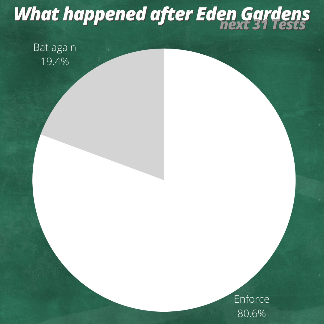 In the 31 tests where teams had a chance to enforce the follow on after the Eden Gardens escape, only six times did teams not do it. It's not that it had no impact, it certainly changed perceptions, but in truth, the big change happens later.