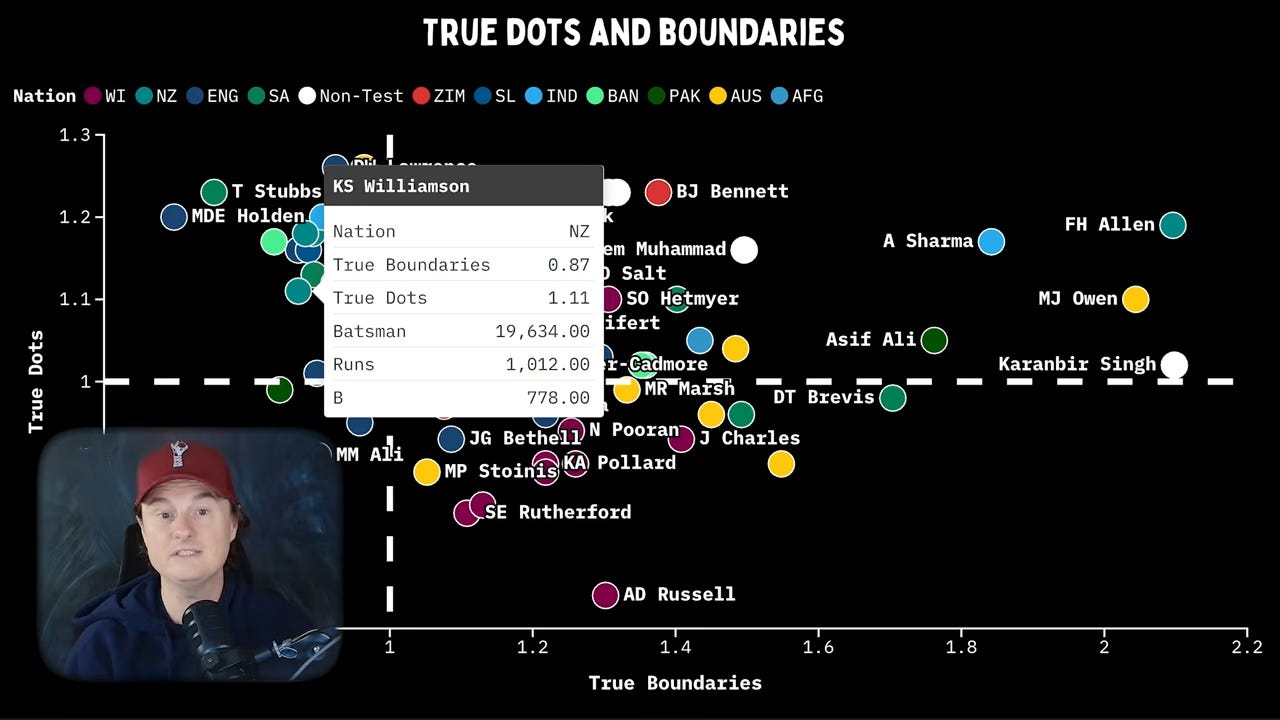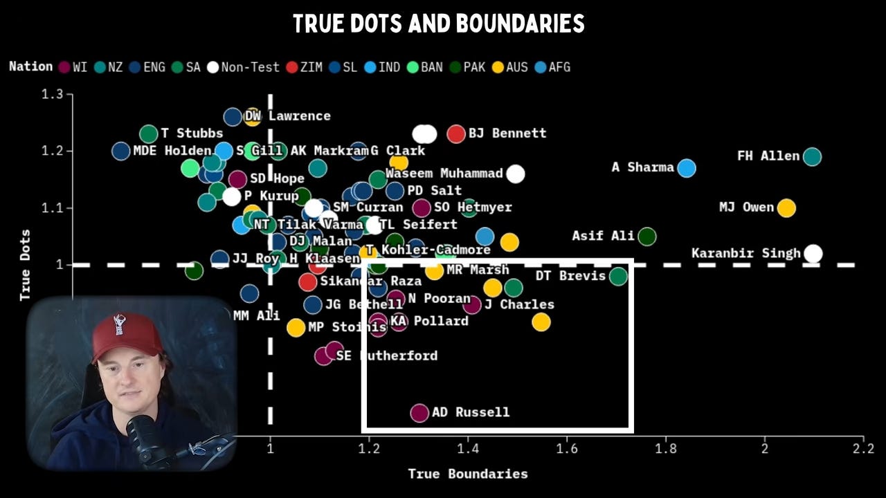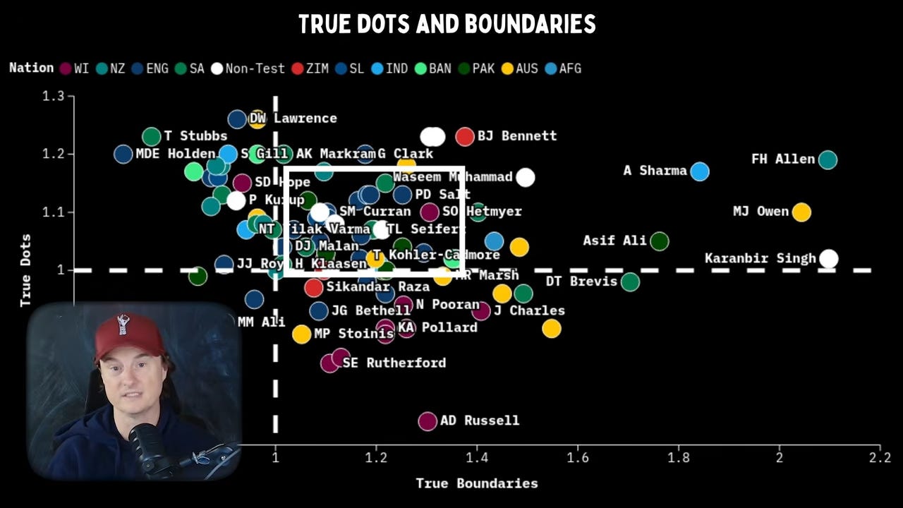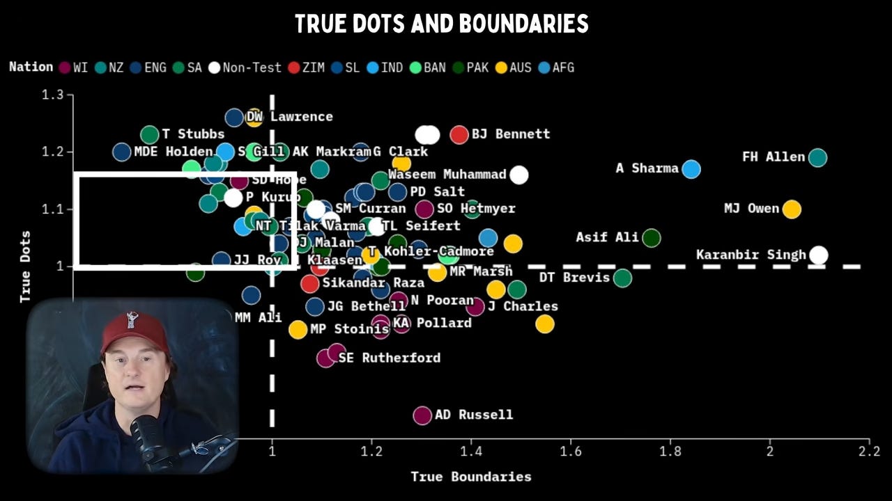 Because in the past, when I was doing work like this, I would look at dot ball percentage. But the problem with that is that in the Powerplay, everyone’s dot ball percentage is a lot higher because you’ve got a bunch of fielders around you. And at the end, you have to try and hit fours and sixes, but you might not actually be an outlier on that. It’s just that you are batting at the end, while someone else is batting in the middle.