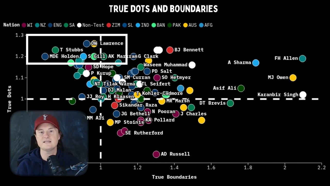 I wouldn’t say that they’re quite anchors, but you can see in Tristan Stubbs’ case that he’s actually 25% less likely to hit a boundary. But his strike rate is often absolutely fine, because he is also 25% more likely not to face dot balls, and he’s brilliant at stealing twos.