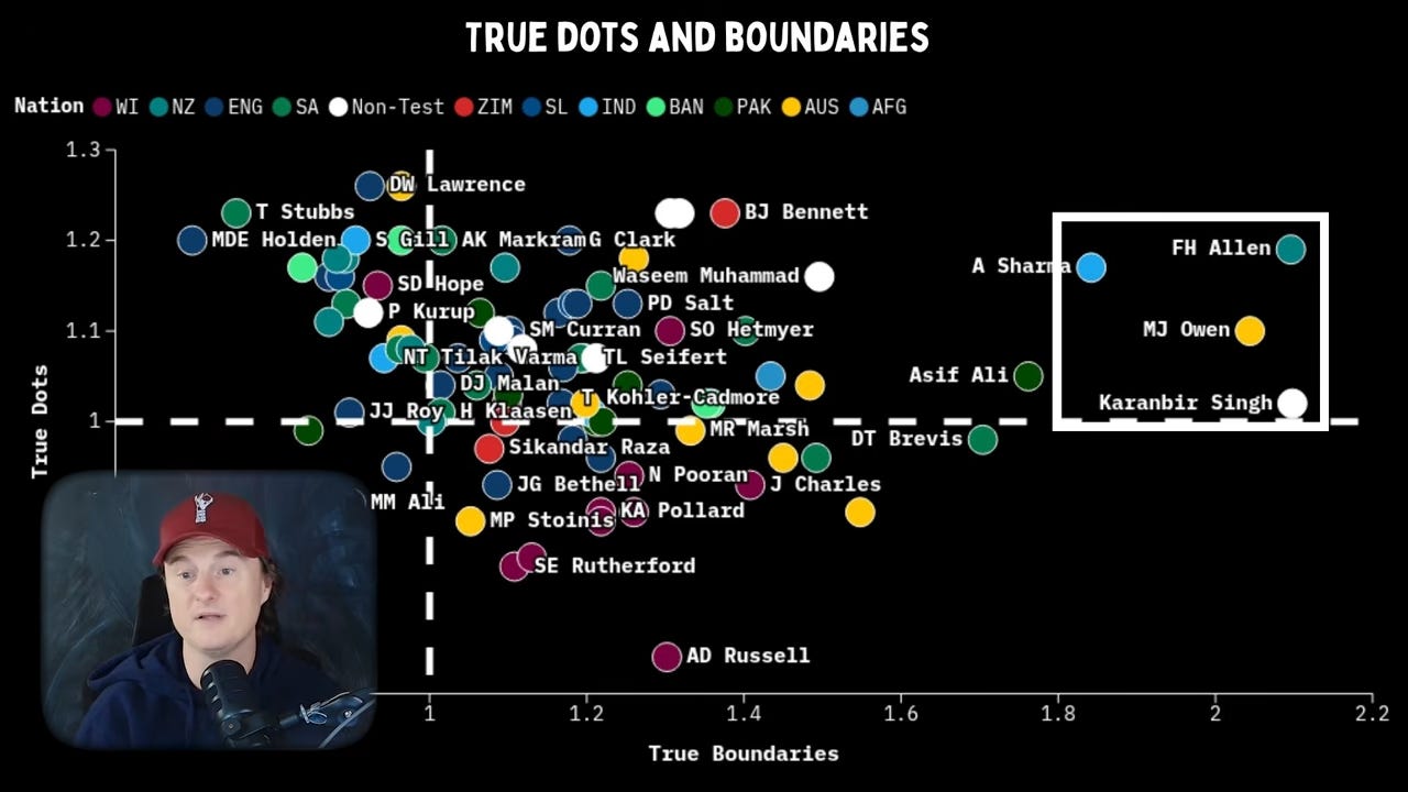 You can see here that Abhishek Sharma is facing 17% fewer dot balls than you would expect. Finn Allen is even higher again, and even Mitch Owen is better than that.