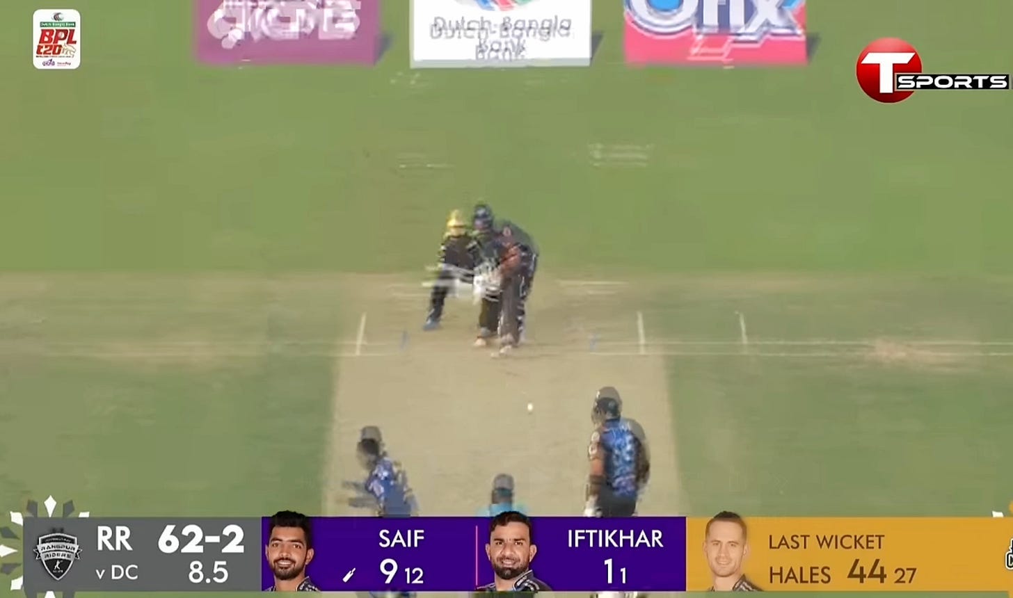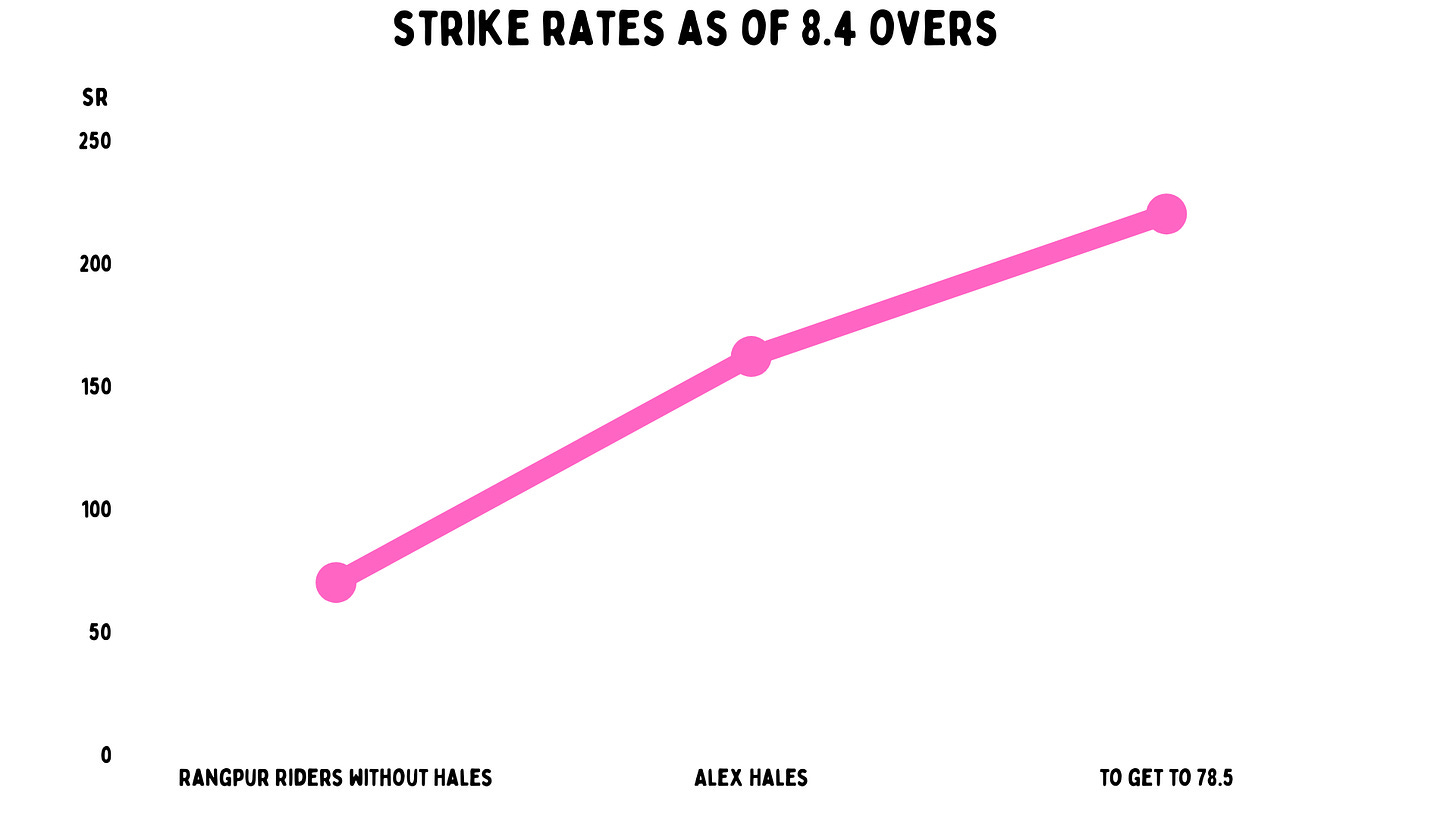 Let’s go back to the end of the eighth over. In the seventh, Curtly Ambrose said on commentary, “They’ve all but given up” about Rangpur Riders. Hales had been smashing the ball, but that was in the powerplay. At this stage the runs needed were very high, 13 runs an over to breach the 78.5. Even with Hales’ powerplay bashing, their run-rate was only 6.75.