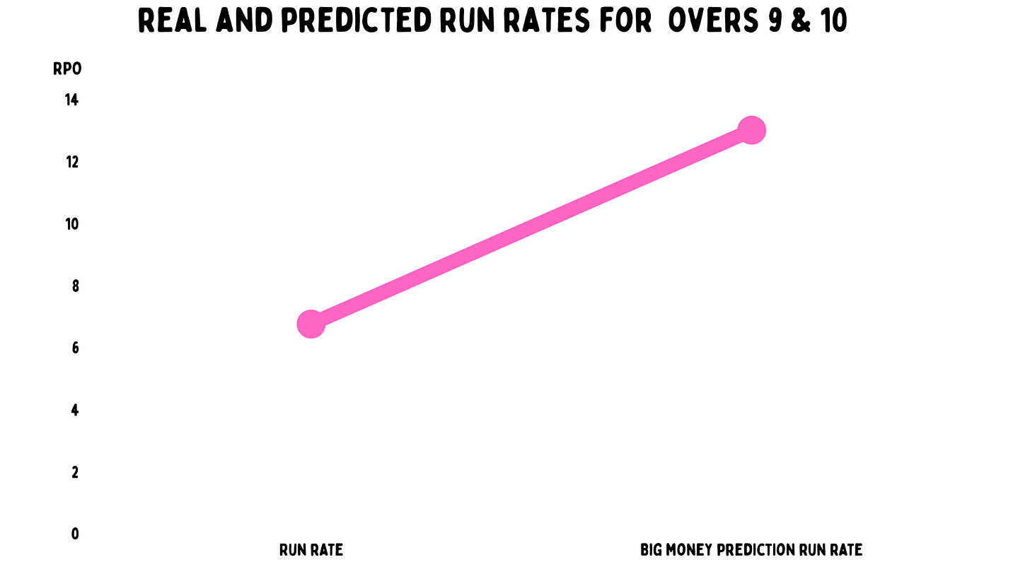 So now, more than three times as many runs were about to come from the next two overs according to large bets. Hales had blocked a ball in the eighth over, and really, no high-intent boundary shots were tried that over at all.