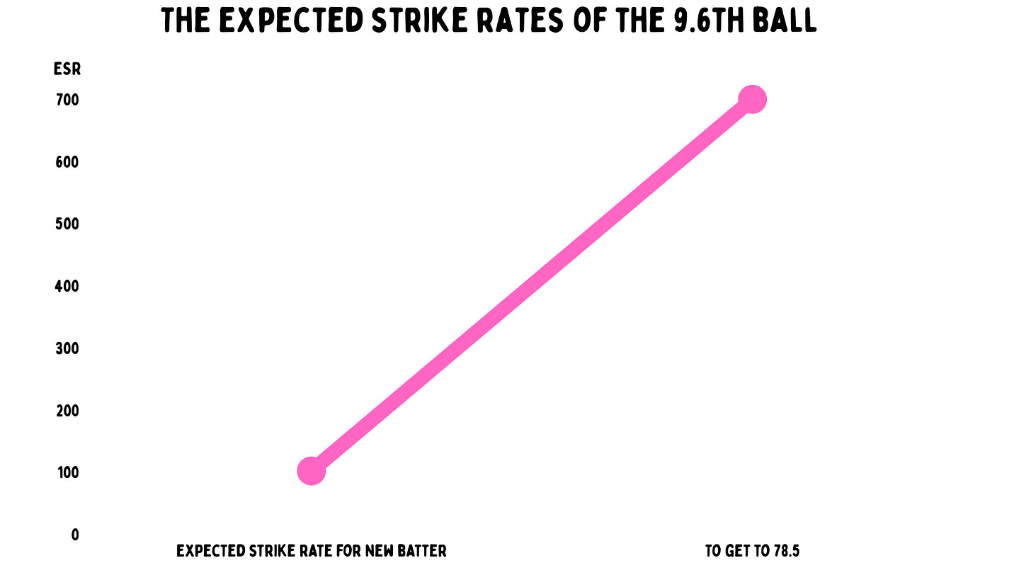 So with the score 72/3, Khushdil Shah comes out to face his first ball (the 9.6th), and to satisfy all those big bets he needs to score a seemingly impossible seven runs off it. We checked his expected strike from this delivery and it was 102.