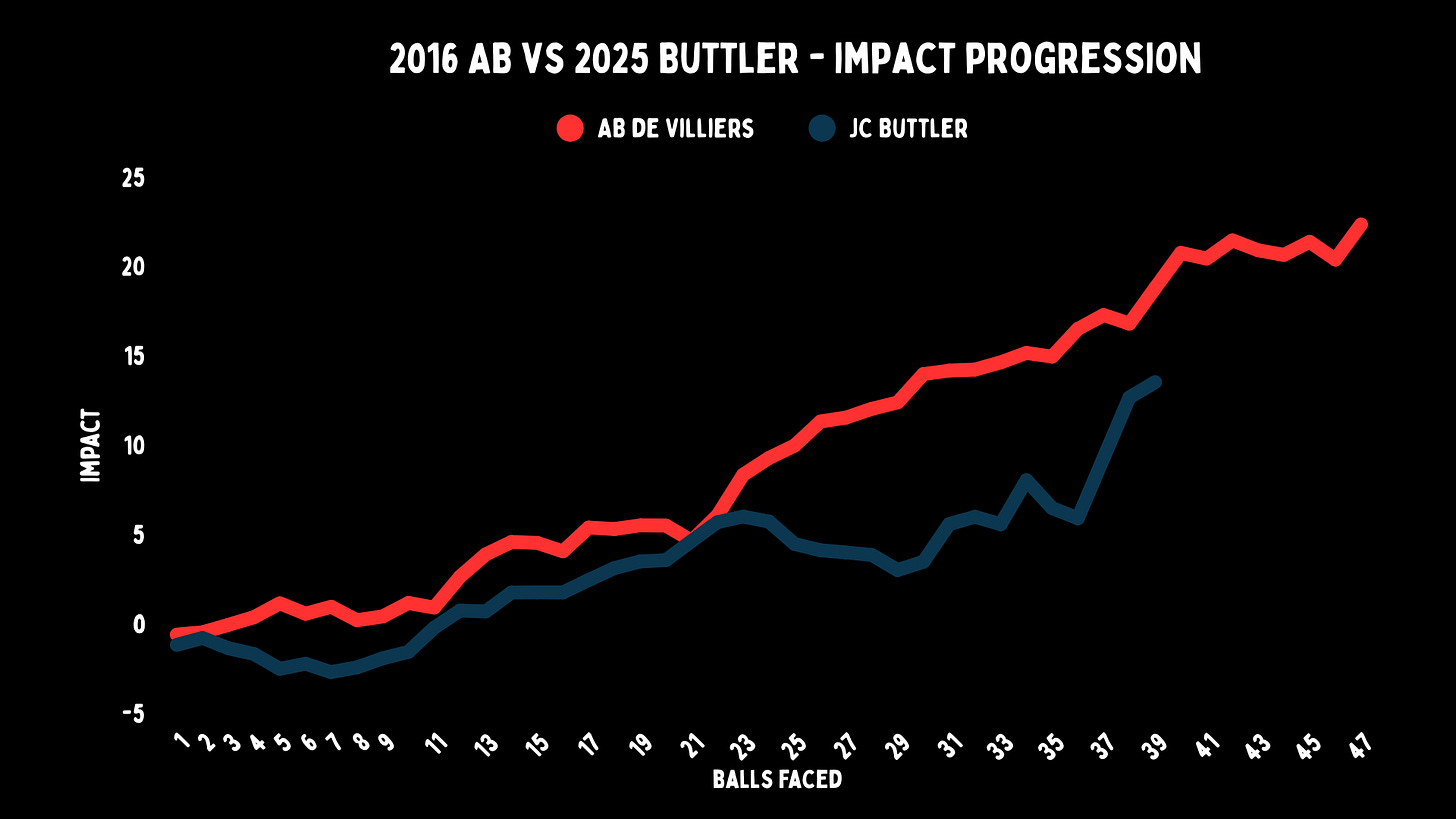 A few years back, I compared Buttler and de Villiers as T20 players. They both have power, but also don’t face many dots. They are like anchors with constant boundaries. Buttler starts slower, with an impact of -1.56 in the first 10 balls, while de Villiers is in the positive. At the 21st ball, they basically have the same impact. But after that, de Villiers is just in a tier of his own, even though Buttler himself is still incredible.
