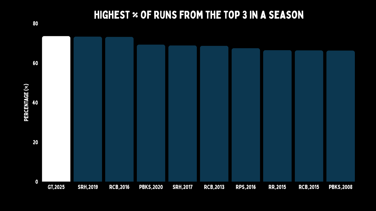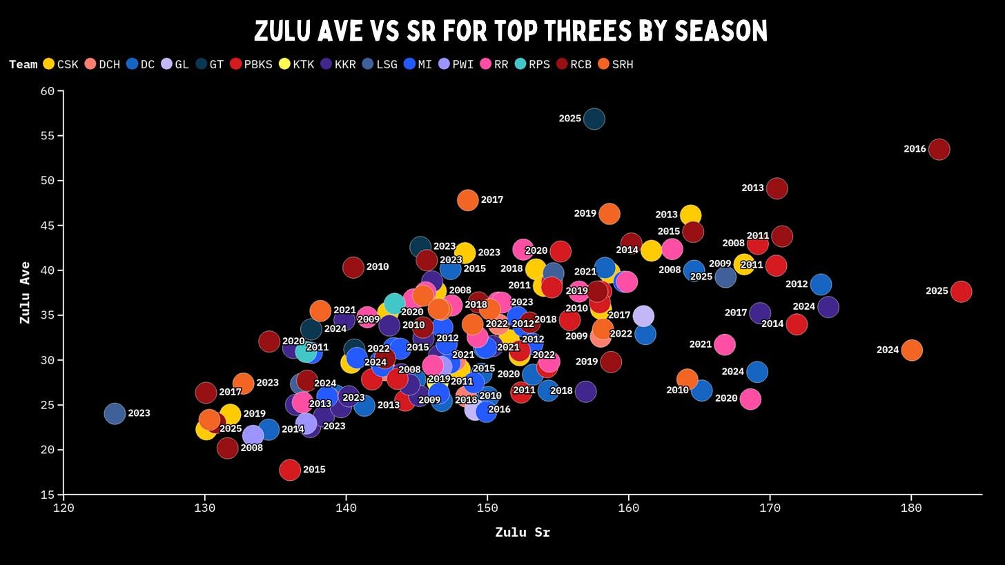 According to Zulu numbers, the only other season that a top 3 averaged over 50 were the RCB top 3 from 2016. However, once adjusted for eras, that top 3 has a Zulu SR of 182 compared to 157 for Gujarat. That really shouldn’t come as a surprise. As we mentioned earlier, two players had all-time great IPL seasons in the same year.