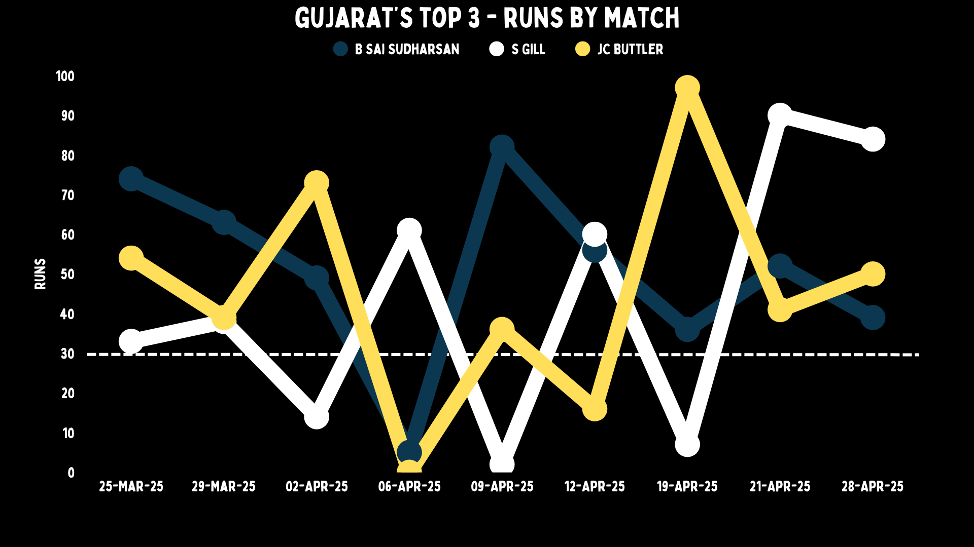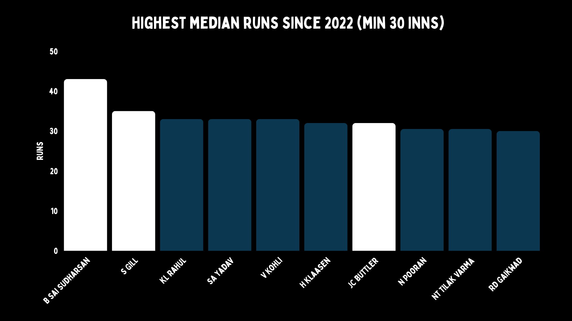 Median scores give us some idea about the consistency of a batter. If we look at the batters with 30 or more innings since IPL 2022, the Gujarat Titans opening duo makes the top three, while their newest signing – Buttler – is joint-sixth on the list.