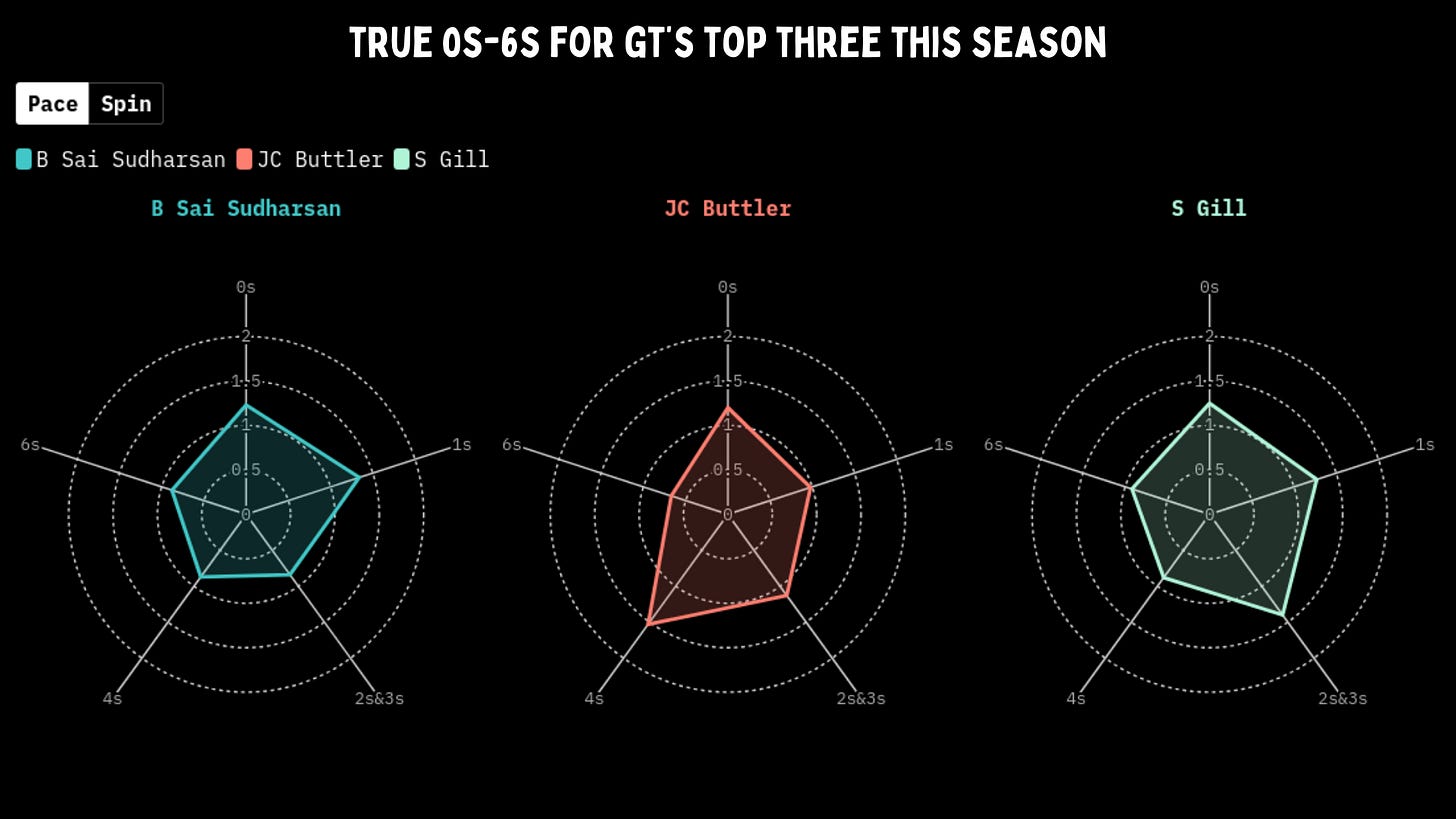 Like a conventional anchor-type batter, Sudharsan faces 23% fewer dots than the average player would if they faced the same overs and takes 34% more singles against pace. He is below the mean on the other aspects. Buttler is very good at minimizing dots and taking twos and threes, and hits 53% more fours than expected, while Gill is well above average at facing less dots than par and running between the wickets.