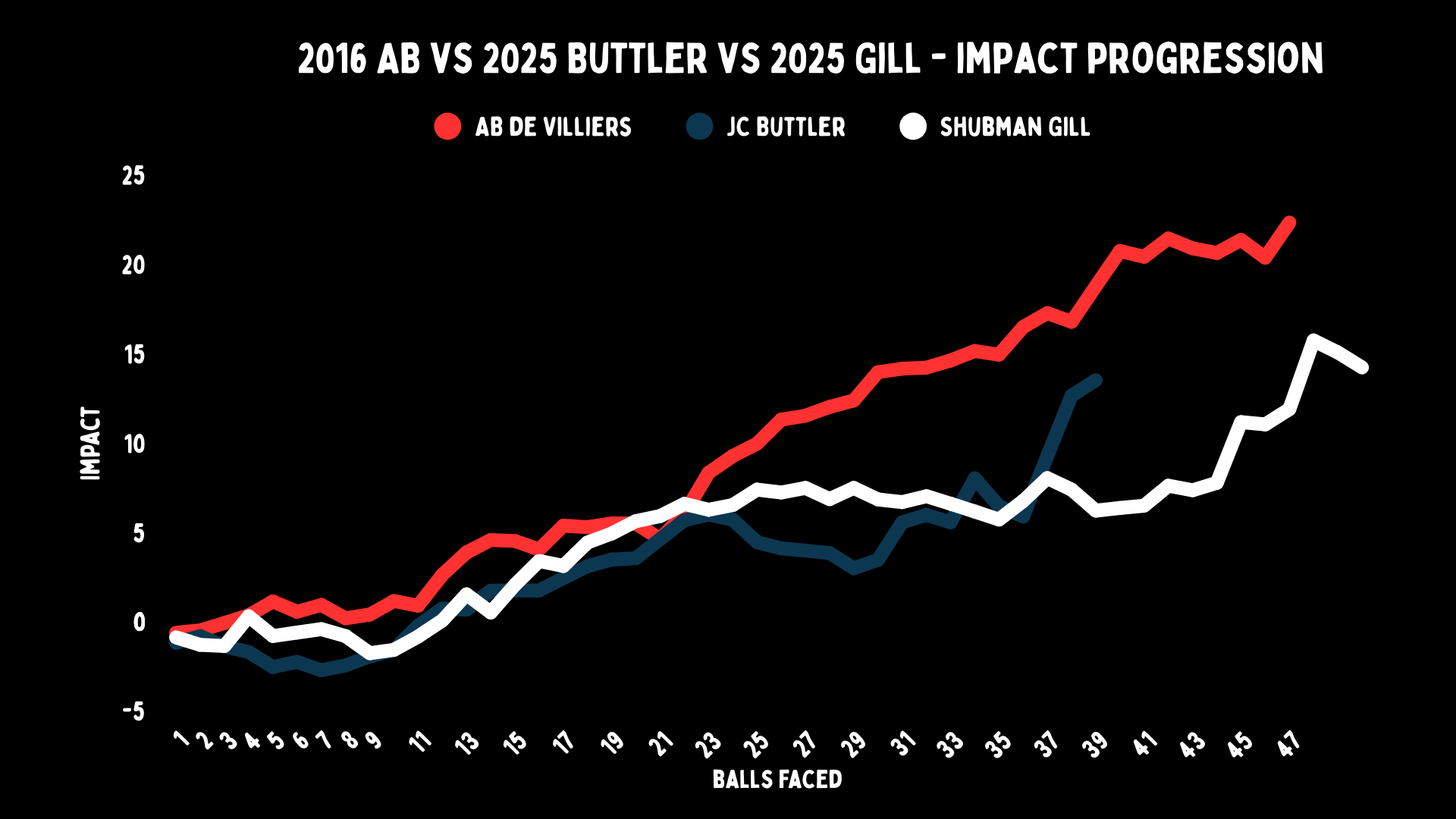 If we add Gill to the same impact progression chart, we notice that the GT skipper is close to Buttler at the 10th ball and then to de Villiers when he gets to the 20th. Again, even though he also accelerates well, it isn’t close to what the South African was doing in 2016.