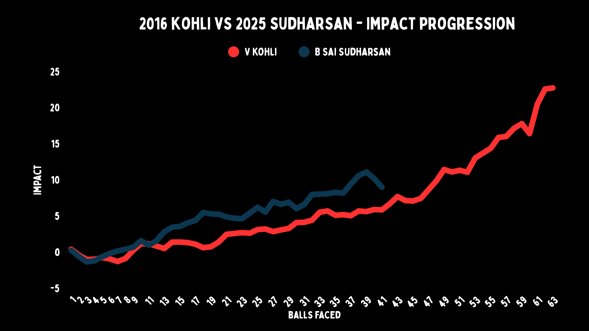 Let’s take a look at impact progressions to get a better idea. You’ll immediately realise how similar these two are till around that 12-ball mark. This is where Sudharsan distances himself from Kohli and is more impactful pretty much throughout. However, as we have stated before, he doesn’t often have incredible highs, he’s more like the bass player in the band.