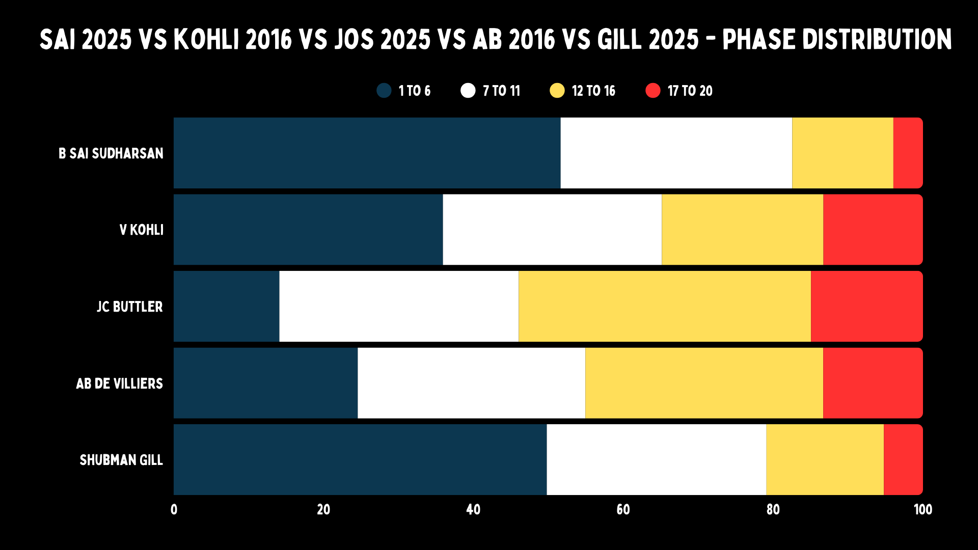 To summarize, here’s a look at the phase distribution for all the five batters that we’ve talked about. Gill lasts till the death more often than Sudharsan, but not as much as Kohli. De Villiers faces slightly more deliveries in the powerplay compared to Buttler.