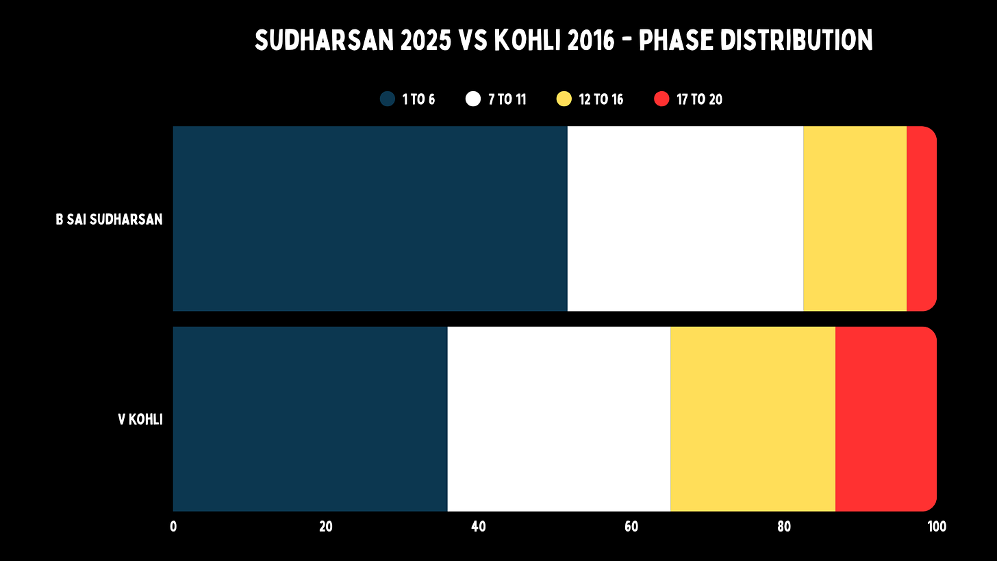While watching Sudharsan this season, we felt that he was batting like 2016 Kohli without the death hitting. If you observe the phase distribution, you can see that Kohli spent a lot more time in the death overs than Sudharsan. The GT left-handed opener seems to be great at getting to the 12 to 16 phase, but he barely lasts till the final few overs.