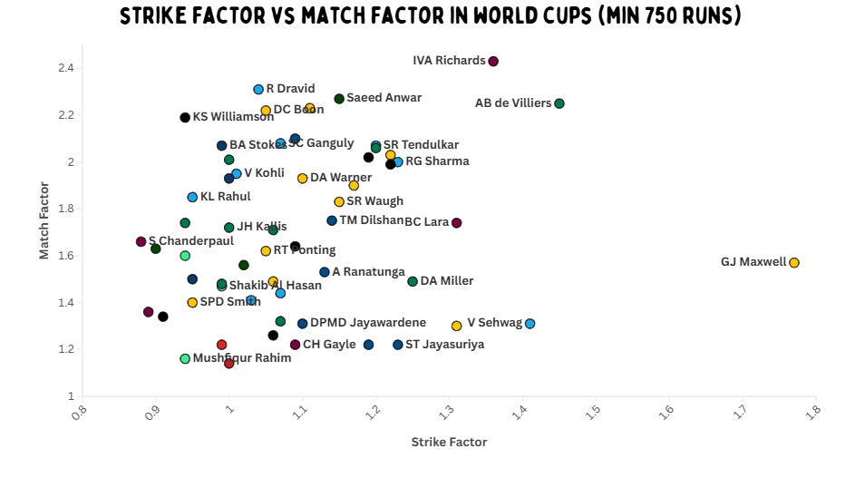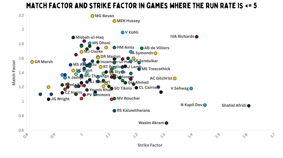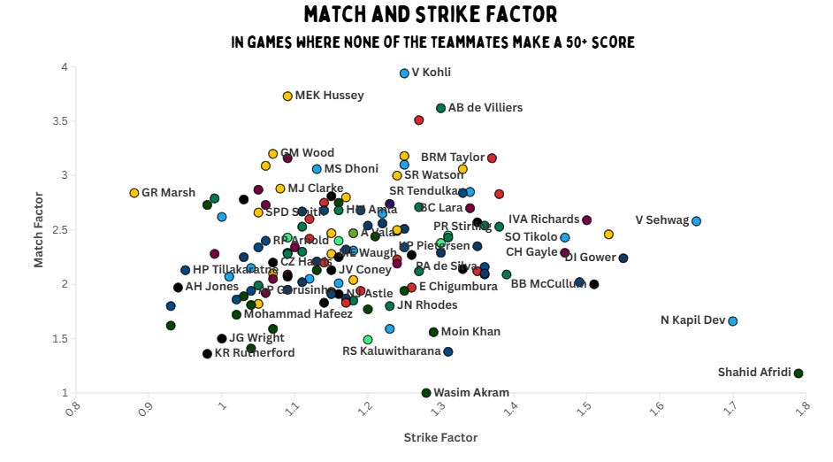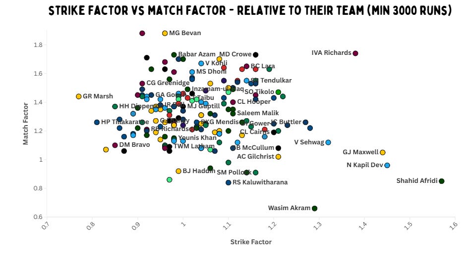 In terms of strike factor, we again see familiar names – Afridi, Kapil, Maxwell, Richards and Sehwag. But Richards also has the third-best match factor, only behind Bevan and Hope – two batters who score slower than their teams.Sean Williams, Sikandar Raza, Brendan Taylor and Paul Stirling are four players who star on this graph. Martin Crowe, Lara, Tendulkar, Allan Lamb and Arjuna Ranatunga are also incredible compared to their teams.