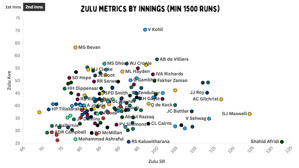 In chases, Virat Kohli’s numbers are just insanity. His Zulu metrics are an average of 70 and a strike rate of 97. De Villiers scores at a run a ball, and still has the third-highest batting average. Richards has a record that pales in comparison to his first innings numbers, but it is still incredible – averaging 52 at nearly a run a ball.