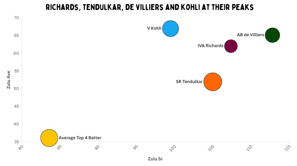 This graph rewards players who don’t play on strong teams, and makes it difficult for the ones who do so – unless you’re an outlier in a great side like Richards or de Villiers.