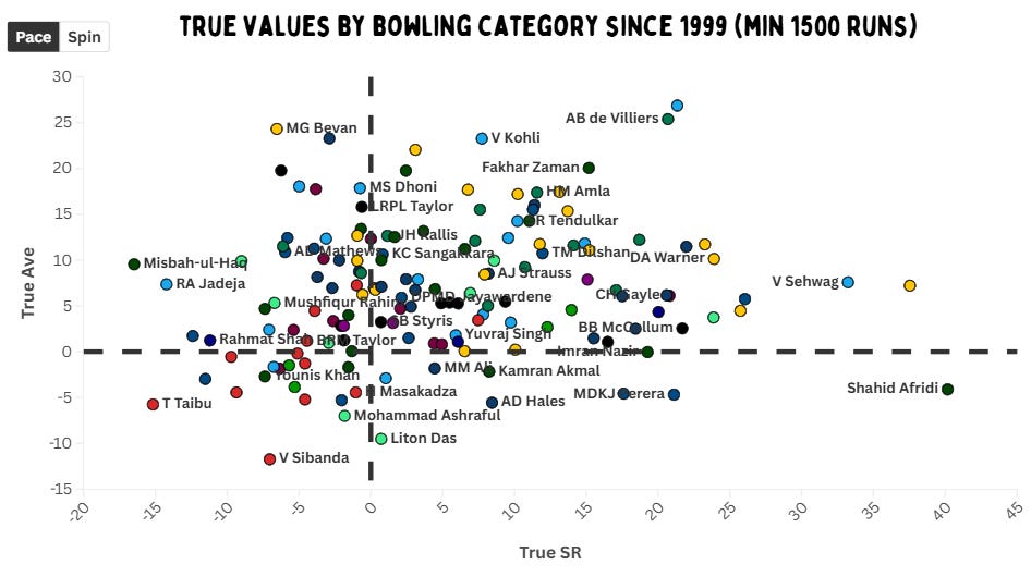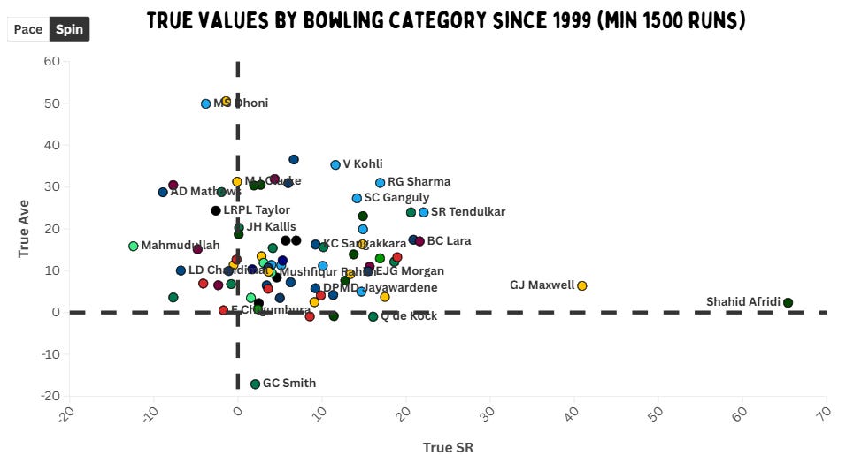 Afridi is again the quickest against spin – except this time nobody even comes close. Maxwell is also an outlier, yet his true strike rate is a staggering 25 less than Afridi’s. Tendulkar, Brian Lara and Buttler are the others in the top five – and they also have solid true averages. De Villiers is just a bit behind Tendulkar. Inzamam-ul-Haq, Sourav Ganguly and Gautam Gambhir are also really good against spin bowling.