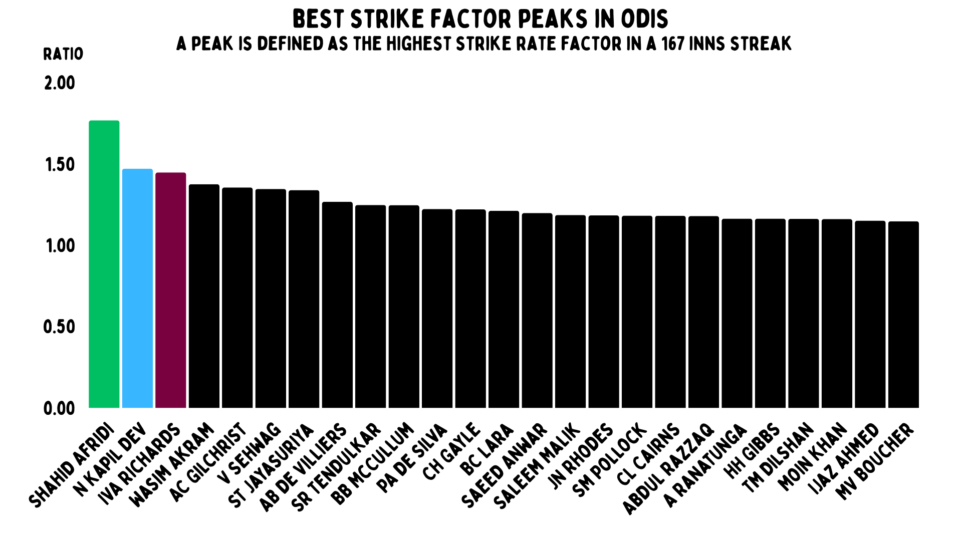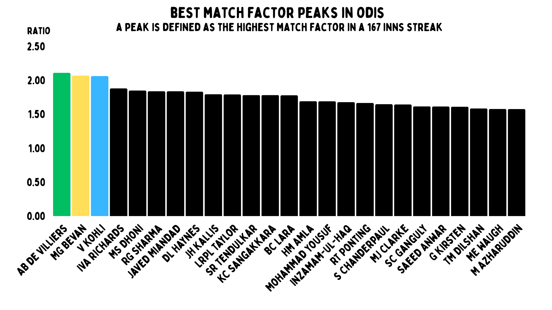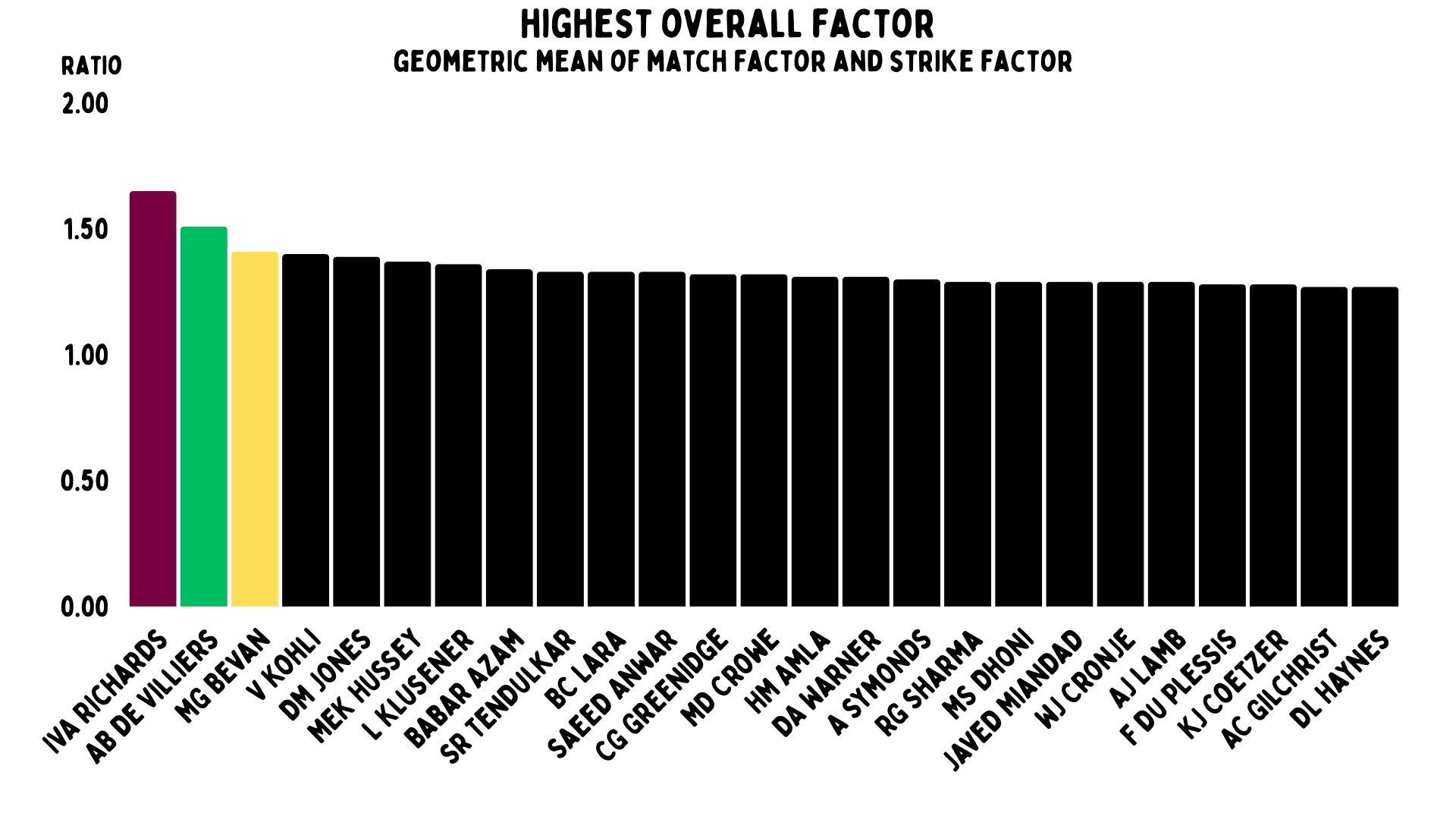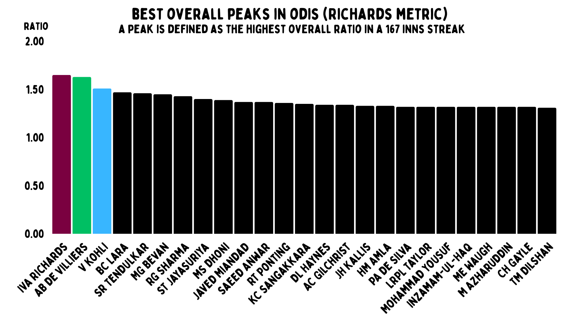 And you can just see why we named this after Viv Richards. His overall ratio was 1.65. That is absolutely ridiculous over such a long period of time. You might have noticed a certain freak called AB de Villiers right behind him – he has an overall ratio of 1.63. He loses to Richards by the barest of margins.