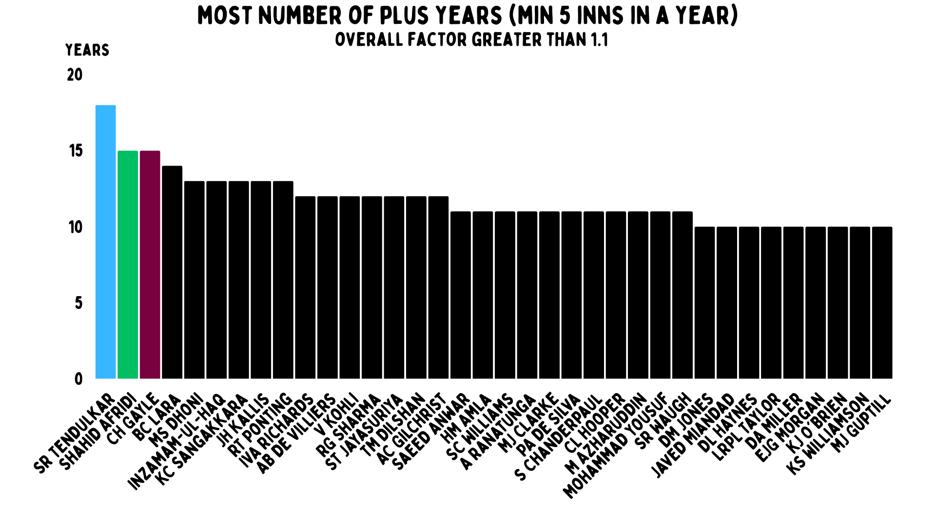 A plus year is when the overall factor is greater than 1.1. In the case of a great year, that mark is 1.4. The batters with the most plus years is Tendulkar, with 18. Afridi and Gayle are joint-second with 15.